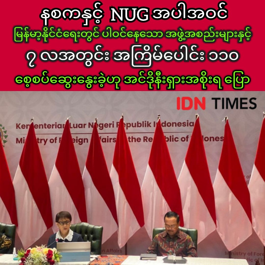 လာမည့်ရက်ပိုင်းအတွင်း ကျင်းပမည့် အာဆီယံနိုင်ငံခြားရေးဝန်ကြီးများအစည်းအဝေးနှင့် ဆက်စပ်အစည်းအဝေးများမကျင်းပခင် ဇူလိုင် ၇ ရက်နေ့တွင် ပြုလုပ်သော သတင်းစာရှင်းလင်းပွဲ၌ အင်ဒိုနီးရှားနိုင်ငံခြားရေးဝန်ကြီး ရက်နိုမာဆူဒီက ၎င်းနှင့် မြန်မာနိုင်ငံဆိုင်ရာ အာဆီယံဥက္ကဋ္ဌ၏အထူးကိုယ်စားလှယ်ရုံးတာဝန်ရှိသူများသည် မြန်မာ့နိုင်ငံရေးတွင် ပါဝင်နေသောအဖွဲ့အစည်းများ၏တာဝန်ရှိသူများနှင့် လူကိုယ်တိုင်တွေ့ဆုံဆွေးနွေးမှု၊ ဖုန်းဖြင့်ဆက်သွယ်ပြောဆိုမှု၊ အွန်လိုင်းမှတစ်ဆင့်တွေ့ဆုံဆွေးနွေးမှုများအပါအဝင် ၇ လအတွင်း အကြိမ်ပေါင်း ၁၁၀ စေ့စပ်ဆွေးနွေးထားကြောင်း ထုတ်ဖော်ပြောဆိုလိုက်သည်။