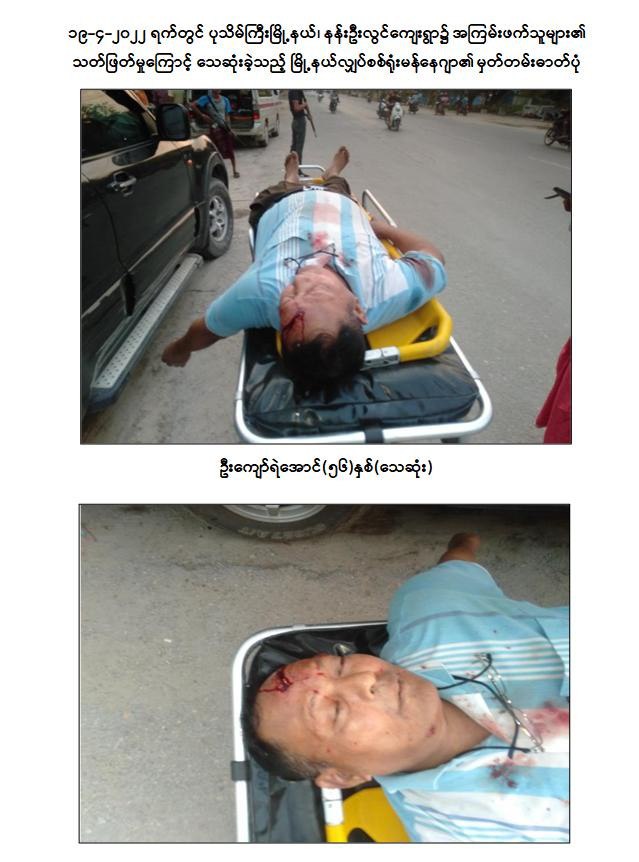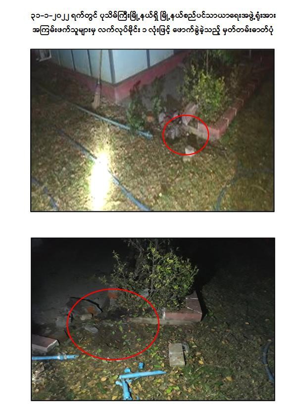 ◾ ၂၀၂၂ ခုနှစ်၊ ဇန်နဝါရီလ ၃၁ ရက်တွင် ငြိမ်းချမ်းအောင်၊ ဖမ်းဆီးရန်ကျန်တရားခံများဖြစ်သည့် အယ်နှောင်း၊ ကိုကြီးတို့မှ ပုသိမ်ကြီးမြို့နယ်၊ မြို့နယ်စည်ပင်သာယာရေးရုံးအား လက်လုပ်မိုင်း ၁ လုံးဖြင့် ပစ်ခတ်ဖောက်ခွဲခဲ့ကြောင်း ထွက်ဆိုခဲ့သည်။