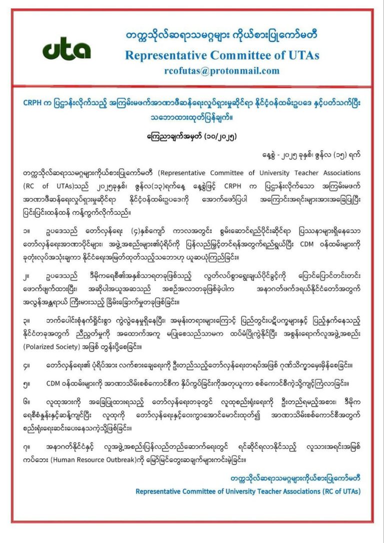 အပြစ်မဲ့အမျိုးသမီးများနှင့် ကလေးသူငယ်များကို အတင်းချုပ်နှောင် ဖမ်းဆီးခြင်း၊ အပြစ်မဲ့ပြည်သူများ၊ နိုင်ငံ့ဝန်ထမ်းများကို အကြပ်ကိုင်ခြိမ်းခြောက်ချုပ်နှောင်ခြင်းများသည် ဂျီနီဗာကွန်ဗန်းရှင်းများနှင့် အပြည်ပြည်ဆိုင်ရာ ဥပဒေတို့အရ စစ်ရာဇဝတ်မှု (War Crime) ကျူးလွန်ရာရောက်ပြီး အဆိုပါ စစ်ရာဇဝတ်မှုများအတွက် အကြမ်းဖက်မှု တိုက်ဖျက်ရေးဥပဒေရာဇသတ်ကြီးနှင့် သက်ဆိုင်ရာ တည်ဆဲဥပဒေများဖြင့် ၎င်းတို့အပေါ် ထိရောက်စွာ အရေးယူနိုင်ရေး လုံခြုံရေးတပ်ဖွဲ့ဝင်များက အကြမ်းဖက်ချေမှုန်းရေး ဆောင်ရွက်မှု ( Counter-terrorism Action ) ဆောင်ရွက်သွားမည်ဖြစ်ကြောင်းနှင့် အများပြည်သူများအနေဖြင့် အကြမ်းဖက်အဖွဲ့၏ လှုပ်ရှားမှုသတင်းများရရှိပါက လုံခြုံရေးတပ်ဖွဲ့ဝင်များထံသို့ လျှို့ဝှက်စွာ သတင်းပေးတိုင်ကြားရန် အသိပေးသတင်းထုတ်ပြန်အပ်ကြောင်း ထုတ်ပြန်ချက်တွင် ဖော်ပြထားသည်။