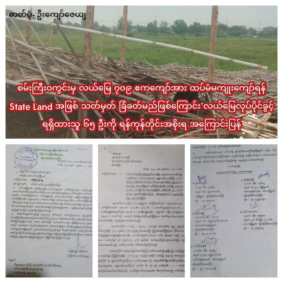 မင်္ဂလာဒုံမြို့နယ်၊ စမ်းကြီးဝကွင်းမှ လယ်မြေ ၇၀၉ ဧကကျော်အား ထပ်မံမကျုးကျော်ရန် State Land အဖြစ် သတ်မှတ် ခြံခတ်မည်ဖြစ်ကြောင်း အသနားခံစာတင်ထားသော လယ်မြေလုပ်ပိုင်ခွင့် ရရှိထားသူ ၆၅ ဦးကို ရန်ကုန်တိုင်းဒေသကြီးအစိုးရအဖွဲ့က အကြောင်းပြန်ကြားထားသည်ဟု သိရသည်။