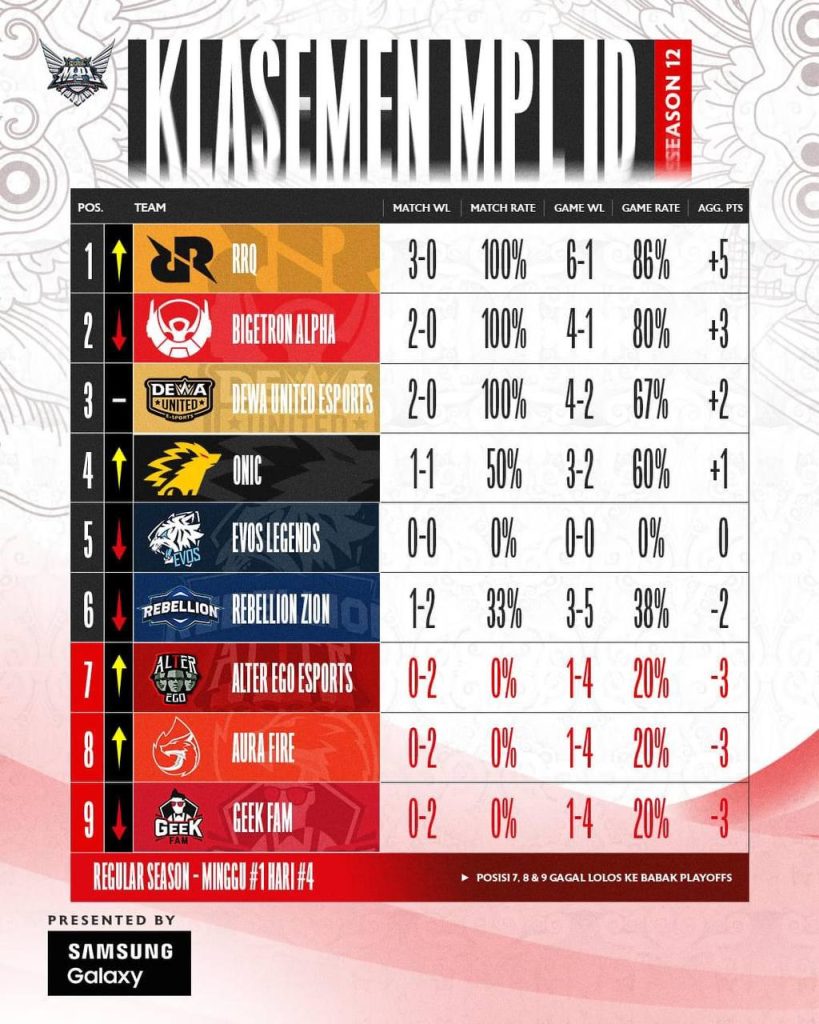 MLBB လောကမှာ အစဉ်အလာကြီးတဲ့ အင်ဒိုနီးရှားနိုင်ငံရဲ့ MPL ID Season 12 ရဲ့ ပထမအပတ်ပွဲစဉ်တွေမှာတော့ RRQ Hoshi အနေနဲ့ နည်းပြ Zeya၊ မြန်မာကစားသမား Naomi တို့ရဲ့ လက်စွမ်းတွေနဲ့အတူ ၃ ပွဲကစား ၃ ပွဲအနိုင်နဲ့ အမှတ်ပေးဇယားရဲ့ ထိပ်ဆုံးနေရာမှာ ရပ်တည်နေခဲ့တာဖြစ်ပါတယ်။