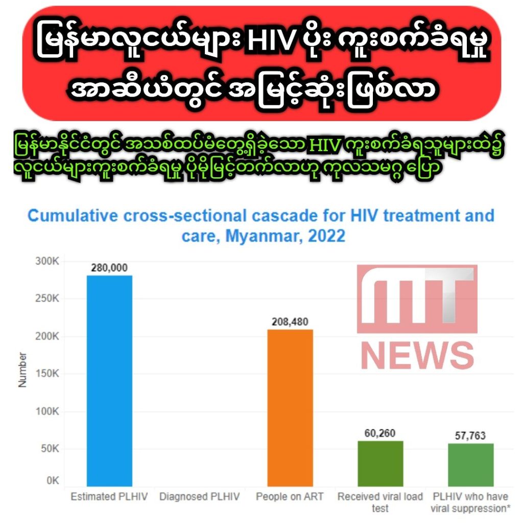 မြန်မာနိုင်ငံတွင် HIV ကူးစက်ခံရသူ အနည်းဆုံး ၂၈၀၀၀၀ ရှိနေပြီး ART ဆေးသောက်သုံးနေရသူဦးရေ ၂၀၈၄၈၀ ဦးရှိနေသည်။ ထို့အပြင် မြန်မာနိုင်ငံတွင်အသစ်ထပ်မံတွေ့ရှိခဲ့သော HIV ကူးစက်ခံရသူဦးရေအနည်းဆုံး ၁၁၀၀၀ ကျော်ရှိနေသော်လည်း သေဆုံးသူအရေအတွက်မှာမူ လျော့နည်းခဲ့ကြောင်း၊ အာဆီယံဒေသအတွင်း HIV ကူးစက်ခံရသူဦးရေ တိုးမြင့်လာခဲ့သော် လည်း HIV နှင့်ဆက်နွှယ်ပြီး သေဆုံးသူအရေအတွက်က ၂၀၁၀ နောက်ပိုင်း အနည်းဆုံးဖြစ်လာခဲ့ကြောင်း သိရသည်။