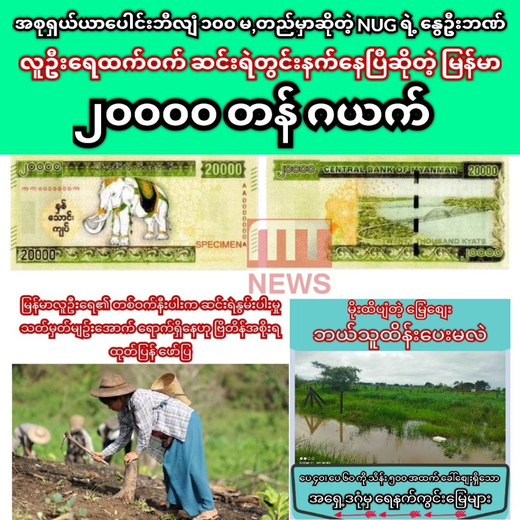 ဒီသတင်းဟာ နဂိုကတည်းကမှ ရွှေနဲ့ဒေါ်လာကို မနည်းထိန်းနေရပြီး တားမရဆီးမရတက်နေလို့ လူထုကြားအကျပ်ရိုက်နေတဲ့ကားစျေးနဲ့ အိမ်ခြံမြေစျေးအပေါ် ဘယ်လောက်တောင် စျေးနှုန်းဆောင့်တက်မလဲ တွေးပူစရာအခြေအနေဖြစ်လာခဲ့ပြီမို့လို့ ဒီတစ်ပတ်ရဲ့ စီးပွားရေးသုံးသပ်ချက်အဖြစ်တော့ NUG က သူ့ နွေဦးဖွံ့ဖြိုးရေးဘဏ်အတွက် မ,တည်ငွေ ဒေါ်လာငါးသိန်းသတ်မှတ်မှာဖြစ်ပြီး အစုရှယ်ယာ ဘီလျံ ၁၀၀ သတ်မှတ်မယ် ပြောလာတာ၊ မြန်မာလူဦးရေရဲ့ တစ်ဝက်နီးပါးက ဆင်းရဲ နွမ်းပါးမှု သတ်မှတ်မျဥ်းအောက် ရောက်ရှိနေပြီလို့ ဗြိတိန်အစိုးရ ထုတ်ပြန်လာတာနဲ့ ကျပ် ၂၀၀၀၀ တန် ငွေစက္ကူရိုက်ထုတ်မယ်လို့ ကြေညာလိုက်တဲ့အကြောင်းတွေကိုပဲ သုံးသပ်ချင်ပါတယ်။