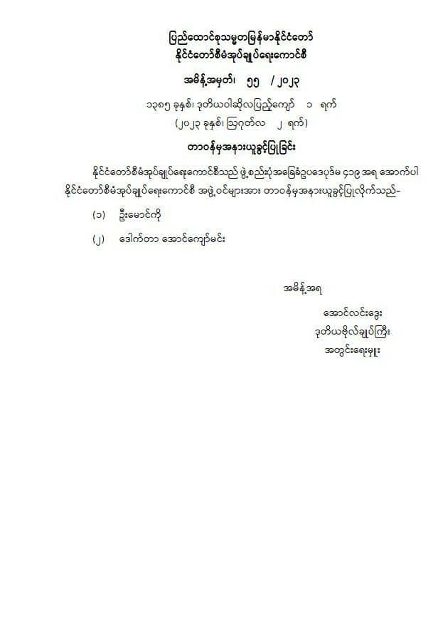နိုင်ငံတော်စီမံအုပ်ချုပ်ရေးကောင်စီအဖွဲ့ဝင်နှစ်ဦးဖြစ်သော ဦးမောင်ကိုနှင့် ဒေါက်တာအောင်ကျော်မင်းတို့ကို တာဝန်မှအနားယူခွင့်ပြုခဲ့ပြီး အဖွဲ့ဝင်တစ်ဦးဖြစ်သည့် ဒေါက်တာကျော်ထွန်းကိုမူ နိုင်ငံတော်စီမံအုပ်ချုပ်ရေးကောင်စီ ဗဟိုအကြံပေးအဖွဲ့၏ အဖွဲ့ဝင်အဖြစ် ပြောင်းရွှေ့တာဝန်ပေးအပ်ခဲ့ကြောင်း သိရသည်။