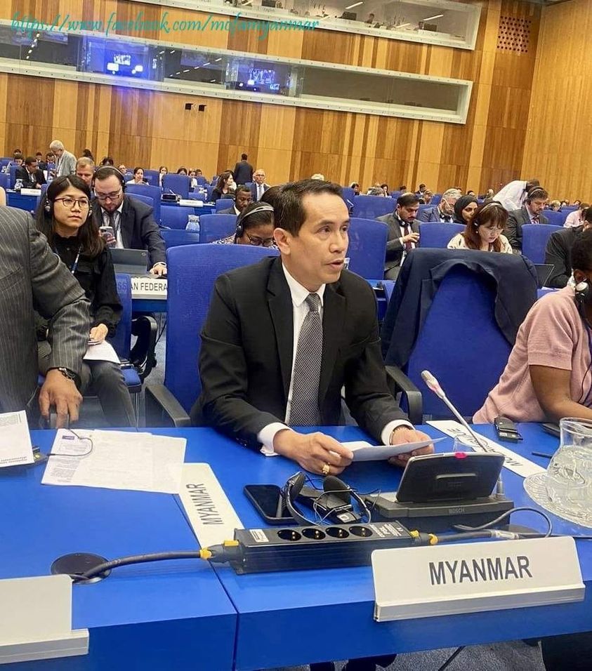 မြန်မာအမြဲတမ်းကိုယ်စားလှယ်က မြန်မာနိုင်ငံသည် NPT စာချုပ်နှင့်အညီ နျူကလီးယားလက်နက်ဖျက်သိမ်းရေးနှင့် မပြန့်ပွားရေးမူဝါဒကို အစဉ်ကိုင်စွဲဆောင်ရွက်လျက်ရှိပြီး ဒေသတွင်းဆောင်ရွက်ချက်အဖြစ် အရှေ့ တောင်အာရှဒေသ နျူကလီးယားလက်နက်ကင်းမဲ့ဇုန်သဘောတူစာချုပ် (SEANWFZ) အကောင်အထည်ဖော်မှု ပိုမိုခိုင်မာစေရေးအတွက် အခြားအာဆီယံအဖွဲ့ဝင်နိုင်ငံများနှင့်အတူ ကြိုးပမ်းလျက်ရှိကာ NPT ၏ အပိုဒ် (၇)နှင့်အညီ နျူကလီးယားလက်နက်ကင်းမဲ့ဇုန်များ ထူထောင်လိုသည့် အခြားဒေသများကိုလည်း ထောက်ခံကြောင်း မိန့်ခွန်းပြောခဲ့သည်။