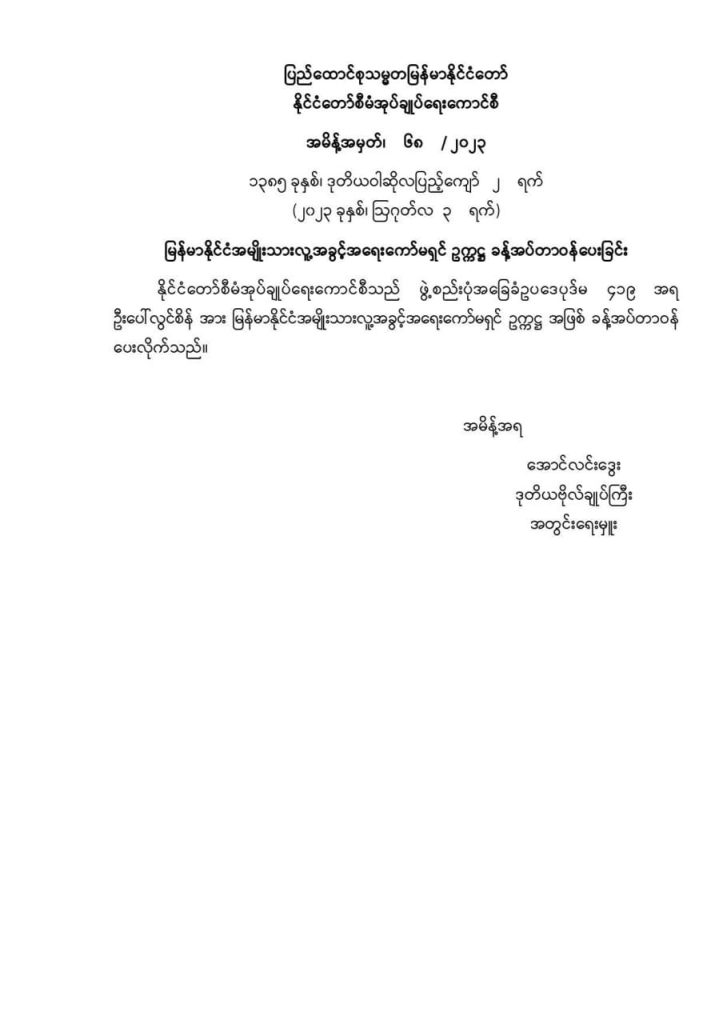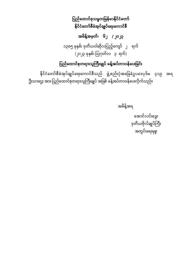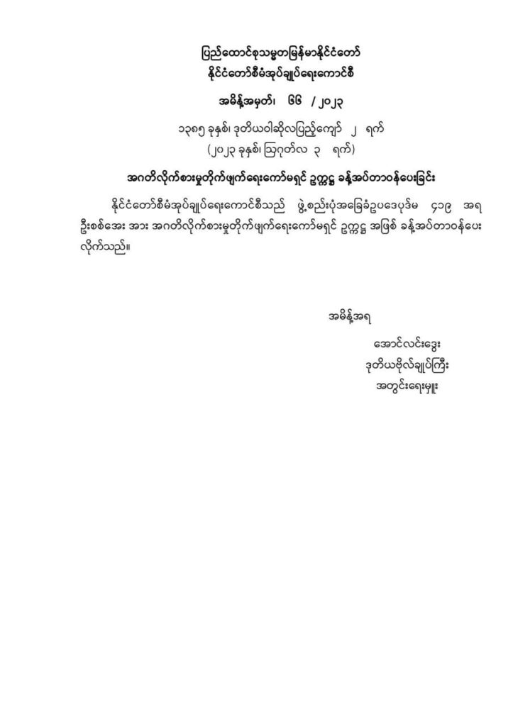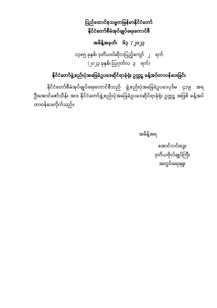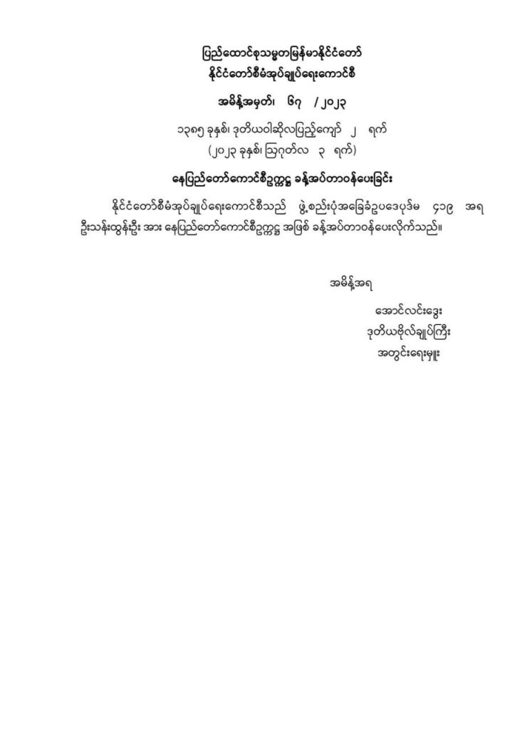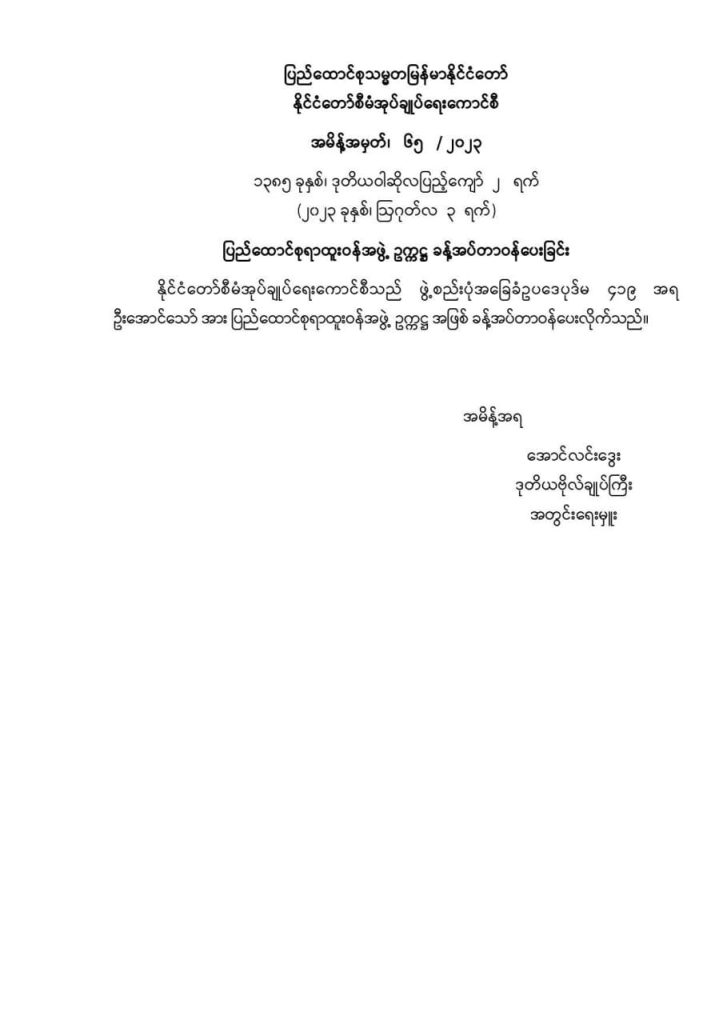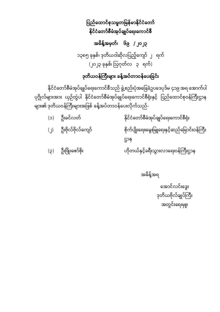 ပြည်ထောင်စုတရားသူကြီးချုပ်အပါအဝင် ပြည်ထောင်စုအဆင့်ပုဂ္ဂိုလ်များကို ယနေ့တွင် ခန့်အပ်တာဝန်ပေးအပ်လိုက်ကြောင်း နိုင်ငံတော်စီမံအုပ်ချုပ်ရေးကောင်စီက ယမန်နေ့က သတင်းထုတ်ပြန်ခဲ့သည်။