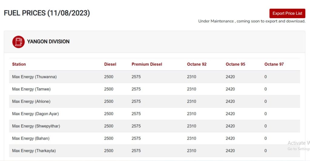 ပြီးခဲ့သည့် ဩဂုတ်လ ၄ ရက်တွင် ဓာတ်ဆီ ၉၂ တစ်လီတာ ၂,၁၂၅ ကျပ်၊ ဓာတ်ဆီ ၉၅ တစ်လီတာ ကျပ် ၂,၂၄၀၊ ဒီဇယ်ရိုးရိုး တစ်လီတာ ၂,၄၀၀ ကျပ်၊ ပရီမီယံဒီဇယ် တစ်လီတာ ၂,၄၇၅ ကျပ်သာရှိခဲ့သည့် ပြည်တွင်းစက်သုံးဆီ ဈေးနှုန်းများသည် ဩဂုတ်လ ၁၁ ရက် (ယနေ့)တွင် ဓာတ်ဆီ ၉၂ တစ်လီတာ ၂,၃၁၀ ကျပ်၊ ဓာတ်ဆီ ၉၅ တစ်လီတာ ကျပ် ၂,၄၂၀၊ ဒီဇယ်ရိုးရိုး တစ်လီတာ ၂,၅၀၀ ကျပ်၊ ပရီမီယံဒီဇယ် တစ်လီတာ ၂,၅၇၅ ကျပ်အထိ မြင့်တက်ခဲ့ကြောင်း ပြည်တွင်းစက်သုံးဆီအရောင်းဆိုင်များမှ သိရသည်။