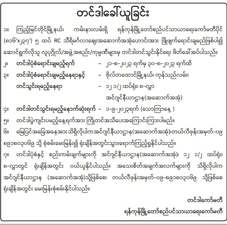 တင်ဒါပွဲကျင်းပမည့်နေ့ရက်အား ကြိုတင်အသိပေးအကြောင်းကြားမည်ဖြစ်ပြီး မြေပြင်အခြေအနေများ သိရှိလိုပါက အင်ဂျင်နီယာဌာန(အဆောက်အအုံ)၊ ဖုန်းနံပါတ် ၀၉-၈၉၁၈၀၃၀၆၉ သို့ စုံစမ်းမေးမြန်း၍ ရုံးချိန်အတွင်း သွားရောက်ကြည့်ရှုနိုင်ကြောင်း ဖော်ပြထားသည်။
