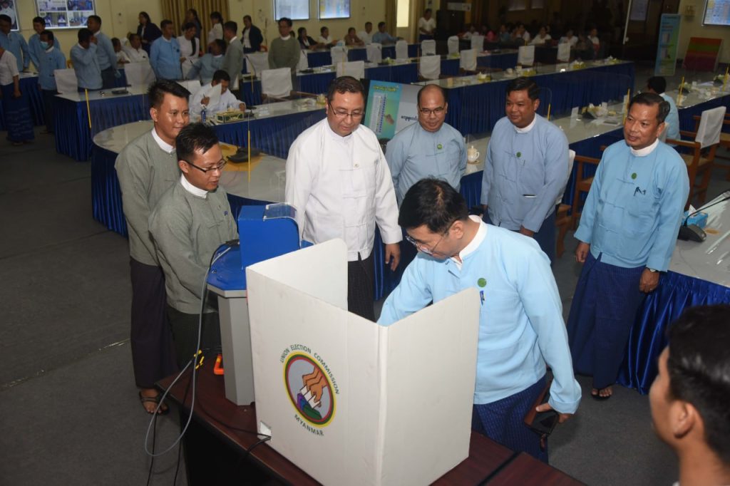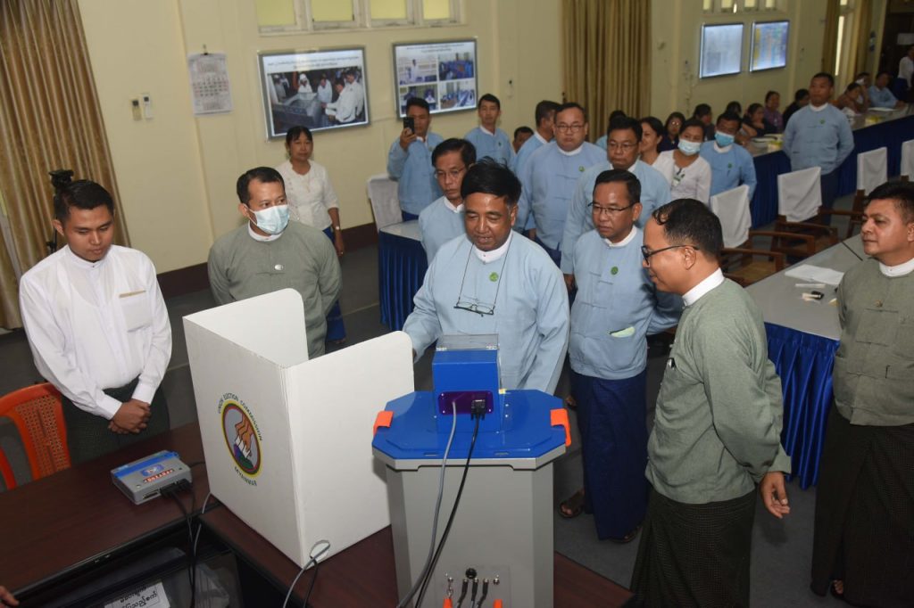 မြန်မာအီလက်ထရောနစ် မဲပေးစက်နှင့်စပ်လျဉ်း၍ ရှင်းလင်းပြသခြင်းနှင့် လက်တွေ့သရုပ်ပြ စမ်းသပ်မဲပေးခြင်းကို ယနေ့ ဩဂုတ်လ ၁၄ ရက် နံနက်ပိုင်းက နေပြည်တော်ရှိ ပြည်ထောင်စုအစိုးရ အဖွဲ့ရုံးဝန်ကြီးဌာန အစည်းအဝေးခန်းမတွင် ပြုလုပ်ခဲ့ကြောင်း သိရသည်။