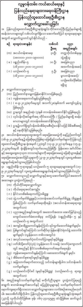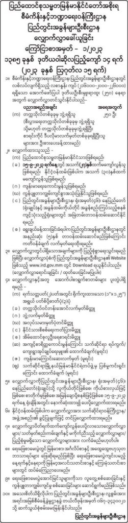 စီမံကိန်းနှင့်ဘဏ္ဍာရေးဝန်ကြီးဌာန၊ ပြည်တွင်းအခွန်များဦးစီးဌာနတွင် လစ်လပ်လျက်ရှိသည့် လစာနှုန်း ကျပ် (၂၁၆,၀၀၀- ၂၀,၀၀၀-၂၂၆,၀၀၀) ရရှိသော ဒုတိယဦးစီးမှူးရာထူး ၂၅၀ နေရာအတွက် လျှောက်လွှာတင်သွင်းနိုင်ပြီး လျှောက်ထားသူသည် အသက် ၂၇ နှစ်ထက် မကျော်လွန်ဘဲ တက္ကသိုလ် ဘွဲ့တစ်ခုခုရရှိသူ (စီးပွားရေးတက္ကသိုလ်တစ်ခုခုမှ ဘွဲ့ရရှိထားသူ သို့မဟုတ် တက္ကသိုလ်ဘွဲ့တစ်ခုရရှိပြီး စာရင်းကိုင် ဒီပလိုမာတစ်ခုခုရရှိပြီးသူများအား ဦးစားပေးမည်) ဖြစ်ကြောင်း ကြေညာထား သည်။