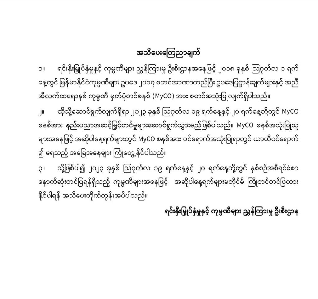 ထိုသို့ဆောင်ရွက်လျက်ရှိရာ ၂၀၂၃ ခုနှစ် ဩဂုတ်လ ၁၉ ရက်နှင့် ၂၀ ရက်တို့တွင် MyCO စနစ်အား အဆင့်မြှင်တင်မှုများ ဆောင်ရွက်သွားမည်ဖြစ်၍ အသုံးပြုသူများအနေဖြင့် အဆိုပါနေ့ရက်များတွင် MyCO စနစ်အား ဝင်ရောက်အသုံးပြုရာတွင် ယာယီဝင်ရောက်၍ မရသည့်အခြေအနေများ ကြုံတွေ့နိုင်ကြောင်း အသိပေးထားသည်။