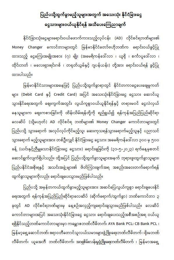 ပြည်ပသို့ အမှန်တကယ်ထွက်ခွာမည့်သူများအား အဆင်ပြေလွယ်ကူစွာ ရောင်းချပေးနိုင်ရေးအတွက် ရန်ကုန်အပြည်ပြည်ဆိုင်ရာလေဆိပ် (ဆိုက်ရောက်/ထွက်ခွာ) ဘဏ်ကောင်တာ သုံးခုတွင် AD လိုင်စင်ရဘဏ်များမှ နေ့စဉ်အလှည့်ကျ ရောင်းပေးသွားမည်ဖြစ်ပါသည်။