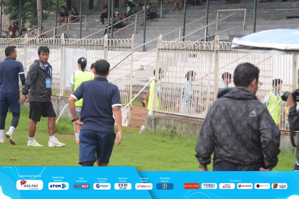 ထို့အတွက် ပြိုင်ပွဲကြီးကြပ်မှ ဆက်လက်ညှိနှိုင်းခဲ့သော်လည်း YUFC အသင်း Technical Director ဦးတင်မောင်ထွန်းမှ ပြိုင်ပွဲကို ဆက်လက်၍ မကစားနိုင်တော့ကြောင်း၊ (၃)ဂိုး၊ (၃)မှတ်ဖြင့် အရှုံးပေးမည်ဖြစ်ကြောင်း ပြောဆိုခဲ့သဖြင့် MNL CEO မှ ပြိုင်ပွဲကို ဆက်လက်ကစားစေချင်ကြောင်း၊ အသင်းနှင့် ပြိုင်ပွဲပုံရိပ်မကျဆင်းစေရန်အတွက် ဆက်လက်ကစားရန် ညှိနှိုင်းပြောဆိုခဲ့သော်လည်း CEO ကစားခိုင်းမှကစားပါမည်ဟု အုပ်ချုပ်/နည်းပြအဖွဲ့မှ အကြောင်းပြန်ခဲ့ကြောင်း၊ ထို့ ကြောင့် MNL CEO မှ YUFC အသင်း CEO ထံ ပြိုင်ပွဲအားဆက်လက်ကစားစေရန် ဖုန်းဖြင့်ဆက်သွယ်ပြောဆိုပြီးနောက် ပြိုင်ပွဲရပ်နားချိန် (၂၆)မိနစ် အကြာတွင် ပြိုင်ပွဲအား ဆက်လက်ကစားရန်သဘောတူခဲ့သဖြင့် ဒိုင်လူကြီးမှ ပြိုင်ပွဲအား ပထမပိုင်း လက်ကျန်မိနစ်+ အချိန်ပို (၁၀)မိနစ်ဖြင့် ဆက်လက်ကစားစေခဲ့ကြောင်း သိရသည်။