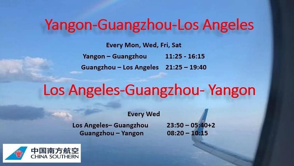 China Southern Airlines လေကြောင်းလိုင်းသည် ရန်ကုန်-ကွမ်းကျိုး- လော့အိန်ဂျယ်လိစ့်မြို့တို့ကို ချိတ်ဆက်ပျံသန်းမည့်ခရီးစဉ်ကို တစ်ပတ်လျှင် လေးရက်နှုန်းဖြင့်ပျံသန်းမည်ဖြစ်သော်လည်း လော့အိန်ဂျယ်လိစ့်- ကွမ်ကျိုး – ရန်ကုန်ခရီးစဉ်ကို တစ်ပတ်ကို တစ်ကြိမ်နှုန်းသာ ပျံသန်းမည်ဖြစ်ကြောင်း သိရသည်။ ရန်ကုန်-ကွမ်းကျိုး- လော့အိန်ဂျယ်လိစ့်မြို့တို့ကို ချိတ်ဆက်ပျံသန်းမည့်ခရီးစဉ်ကို စက်တင်ဘာ ၁ ရက်မှစတင်ပြီး တနင်္လာ၊ ဗုဒ္ဒဟူး၊ သောကြာနှင့် စနေနေ့တို့တွင် ပျံသန်းမည်ဖြစ်သလို လော့အိန်ဂျယ်လိစ့်- ကွမ်ကျိုး – ရန်ကုန်ခရီးစဉ်ကို တစ်ပတ်လျှင် ဗုဒ္ဒဟူးနေ့တစ်ရက်သာ ပျံသန်းသွားမည်ဖြစ်ကြောင်း သိရသည်။