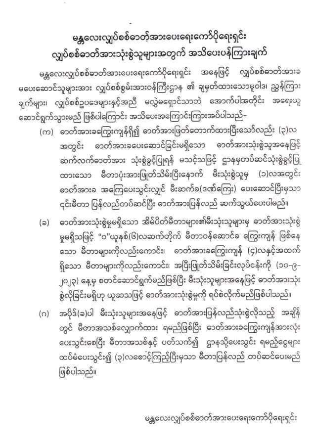 မန္တလေးလျှပ်စစ်ဓာတ်အားပေးရေးကော်ပိုရေးရှင်းအနေဖြင့် လျှပ်စစ်မီတာခမပေးဆောင်သူများကို လျှပ်စစ်စွမ်းအားဝန် ကြီးဌာနမှ ချမှတ်ထားသောမူဝါဒ၊ ညွှန်ကြားချက်များ၊ လျှပ်စစ်ဥပဒေများနှင့်အညီ လုပ်ဆောင်ရာတွင် ဓာတ်အားခကြွေးကျန်ရှိ၍ ဓာတ်အား ဖြတ်တောက်ထားပြီးသော်လည်း (၃)လ အတွင်း ဓာတ်အားခပေးဆောင်ခြင်းမရှိသော ဓာတ်အားသုံးစွဲသူအနေဖြင့် ဆက်လက် ဓာတ်အားသုံးစွဲခွင့်ပြုရန် မသင့်သဖြင့် ဌာနမှတပ်ဆင်သုံးစွဲခွင့်ပြုထားသော မီတာပုံးအားဖြုတ်သိမ်းပြီးနောက် မီးသုံးစွဲသူမှ (၁) လအတွင်း ဓာတ်အားခ အကြေပေးသွင်းလျှင် မီးဆက်ခ(ဒဏ်ကြေး) ပေးဆောင် ပြီးမှသာ ၎င်းမီတာ ပြန်လည်တပ်ဆင်ပြီး ဓာတ်အားပြန်လည် ဆက်သွယ်ပေးမည်ဖြစ်သည်။