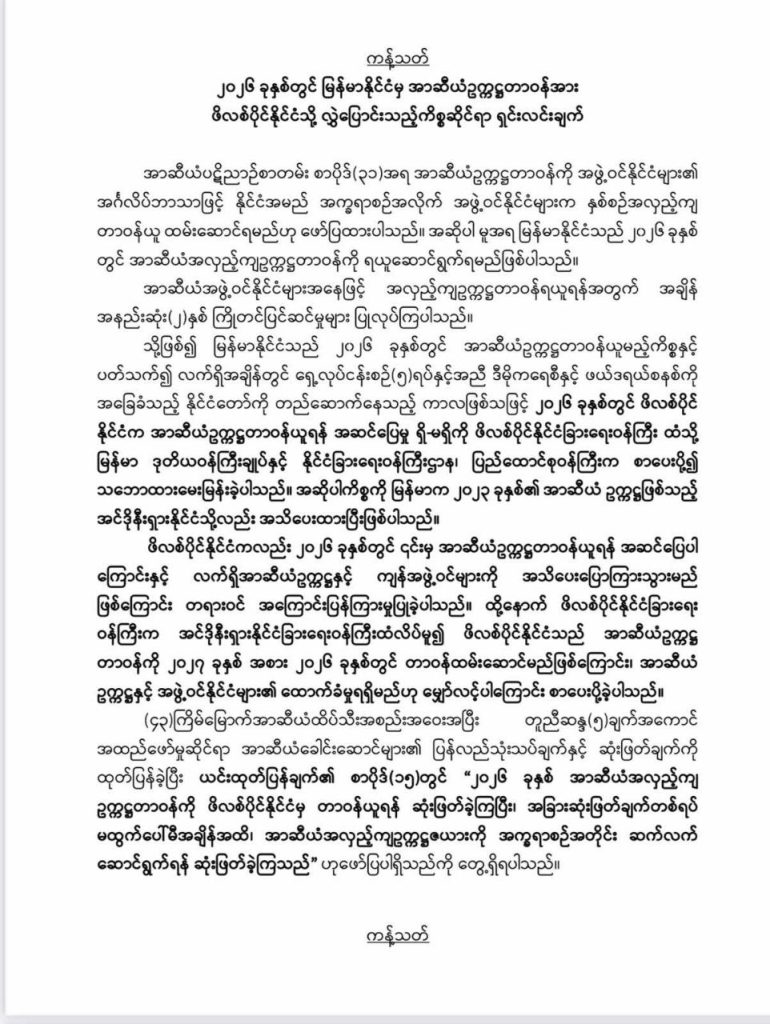 ဤကဲ့သို့ပင် ယခုလည်း မြန်မာနိုင်ငံက မိမိနိုင်ငံ၏ ဦးစားပေးဆောင်ရွက်ရမည့် လုပ်ငန်းစဉ်များရှိ၍ ၂၀၂၆ ခုနှစ် အာဆီယံအလှည့်ကျဥက္ကဋ္ဌတာဝန်ကို ဖိလစ်ပိုင်နိုင်ငံသို့ သဘောထားမေးမြန်းညှိနှိုင်းမှု ပြုလုပ်ခဲ့ပြီး အခြားအဖွဲ့ဝင်နိုင်ငံများသို့ ချပြအသိပေးခြင်း၊ သဘောတူညီမှုရှိခြင်းများဖြင့် လွှဲပြောင်းခဲ့ ခြင်းဖြစ်ကြောင်း ထုတ်ပြန်ချက်တွင်အသိပေးကြေညာထားသည်။