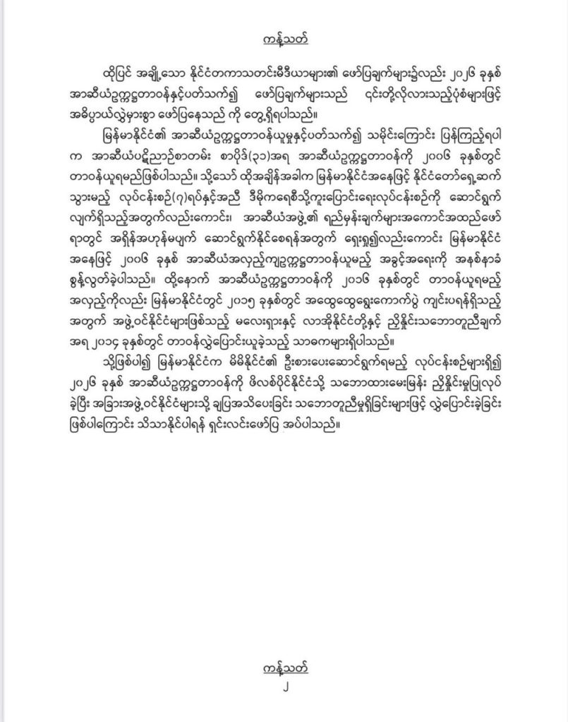 ထို့ပြင် အချို့သော နိုင်ငံတကာမီဒီယာများ၏ ဖော်ပြချက်များ၌လည်း ၂၀၂၆ ခုနှစ် အာဆီယံ အလှည့်ကျ ဥက္ကဋ္ဌတာဝန်နှင့် ပတ်သက်၍ ၎င်းတို့လိုလားသည့်ပုံစံများဖြင့် အဓိပ္ပါယ်လွဲမှားစွာ ဖော်ပြနေသည်ကို တွေ့ရှိရကြောင်း ထုတ်ပြန်ထားသည်။