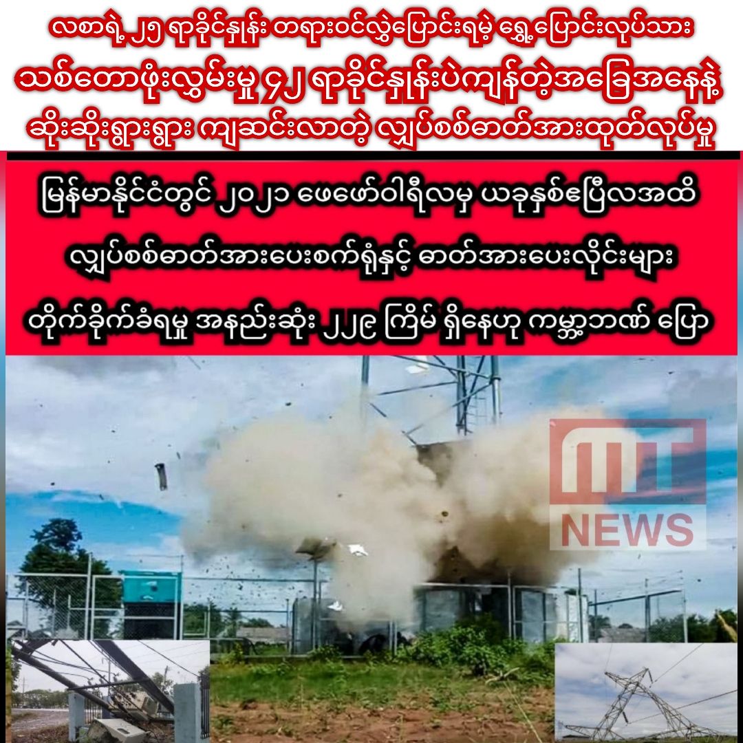 မြန်မာနိုင်ငံမှာ လက်ရှိ ရှိနေတဲ့ လျှပ်စစ်ဓာတ်အားပေးစက်ရုံတွေရဲ့ ၇၇ ရာခိုင်နှုန်းက လက်နက်ကိုင်ပဋိပက္ခဖြစ်ပွားတဲ့ နေရာနဲ့ ၁၀ ကီလိုမီတာအတွင်းရှိနေသလို NUG နဲ့ PDF တွေဖျက်ဆီးမှုကြောင့် လျှပ်စစ်ဓာတ်အားပေးလိုင်းတွေ၊ ဓာတ်အားပေးစက်ရုံတွေ ဖျက်ဆီးခံရပြီးနောက်မှာလည်း လျှပ်စစ်ဓာတ်အားထုတ်လုပ်မှုက တိုးတက်မလာတော့ဘူးလို့ပြောခဲ့ပါသေးတယ်။