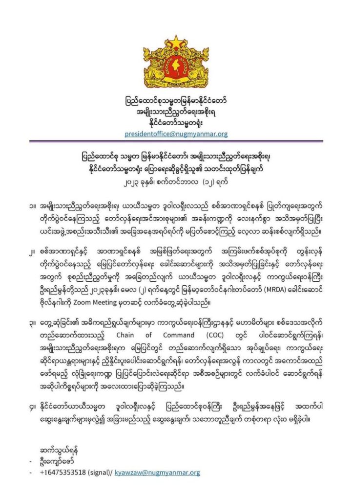 NUG ယာယီသမ္မတ ဒူဝါလရှီးလနှင့် ကာကွယ်ရေးဝန်ကြီး ဦးရည်မွန်တို့သည် ၂၀၂၃ ခုနှစ်၊ မေလ ၂ ရက်တွင် မြန်မာ့တော်ဝင်နဂါးတပ်တော် (MRDA) ခေါင်းဆောင် ဗိုလ်နဂါးကို Zoom Meeting မှတဆင့် လက်ခံတွေ့ဆုံခဲ့သည်ဟု NUG သမ္မတရုံး ပြောရေးဆိုခွင့်ရှိသူ၏ ယနေ့ သတင်းထုတ်ပြန်ချက်တွင် ဖော်ပြထားသည်။
