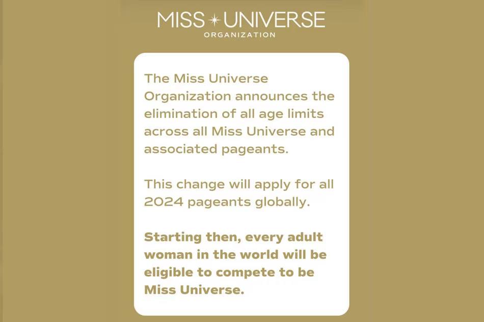 နှစ်ပေါင်း ၇၀ ကျော်ကြာ Miss Universe အဖွဲ့အစည်း (MUO) က အသက် ၁၈ နှစ်ကနေ ၂၈ နှစ်ကြား အမျိုးသမီးတွေသာ ဝင်ရောက်ယှဉ်ပြိုင်ခွင့်ပြုခဲ့ပေမဲ့ ဒီနေ့၊ စက်တင်ဘာ ၁၃ ရက်မှာတော့ ၂၀၂၄ ခုနှစ်ပြိုင်ပွဲကစပြီး အသက် ၂၈ နှစ်အထက် အမျိုးသမီးတွေပါ ဝင်ရောက်ယှဉ်ပြိုင်ခွင့်ပြုတော့မယ်ဆိုတာကို တရားဝင် ကြေညာချက် ထုတ်ပြန်ခဲ့တာပါ။