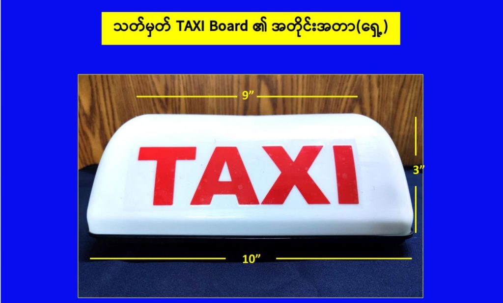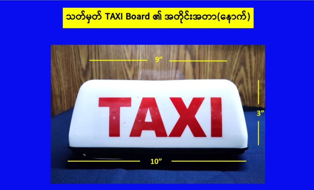 Taxi Board (ဆိုင်းဘုတ်)၏ အရွယ်အစားများမှာ အောက်ခြေအလျား ၁၀ လက်မ၊ အပေါ် အလျား ၉ လက်မ၊ အောက်ခြေအကျယ် ၅ လက်မ၊ အပေါ်အကျယ် ၂ လက်မနှင့် အမြင့် ၃ လက်မ ဖြစ်ပြီး အဆိုပါ Taxi Board ကို ခေါင်မိုးပေါ်မှန်ထိပ်မှ ၁ ပေအကွာ ဘယ် ၊ ညာ ညီညာစွာ တပ်ဆင်ထားရှိရမည်ဖြစ်သည်။