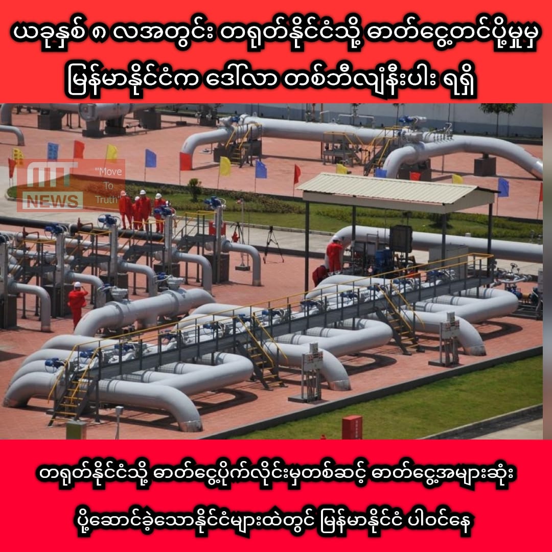 မြန်မာနိုင်ငံသည် တရုတ်နိုင်ငံသို့ ပိုက်လိုင်းမှတစ်ဆင့် ဓာတ်ငွေ့ပို့လွတ်ရာတွင် ရခိုင်ပြည်နယ် ကျောက်ဖြူရေနက်ဆိပ်ကမ်းနှင့် ချိတ်ဆက်ထားသော အရှည် ၇၉၃ ကီလိုမီတာရှိသည့် ရေနံနှင့် ဓာတ်ငွေ့ပိုက်လိုင်းမှတစ်ဆင့် အဓိကထားတင်ပို့ခဲ့ပြီး အဆိုပါ ရေနံနှင့်ဓာတ်ငွေ့ပိုက်လိုင်းတည်ဆောက်ပို့လွတ်မှုများသည် ၁၀ နှစ် ပြည့်ခဲ့ပြီဖြစ်ကြောင်း သိရသည်။