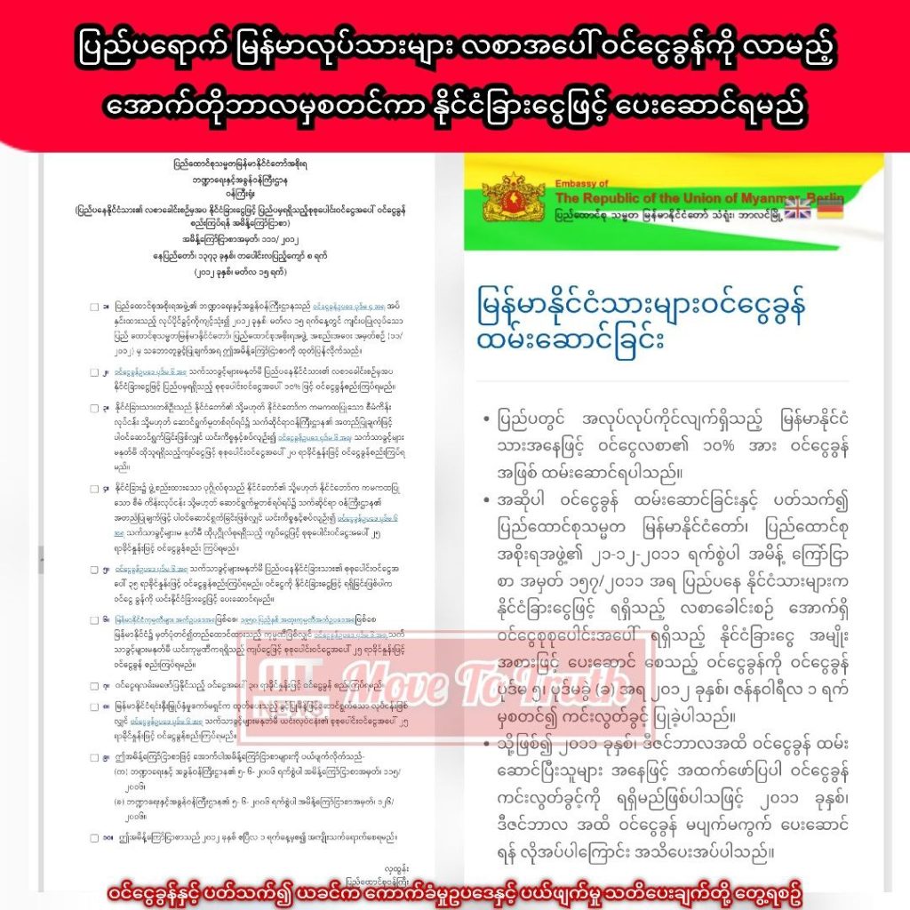 ပြည်ပနေနိုင်ငံသားများ၏ လစာအပေါ် ဝင်ငွေခွန် ကင်းလွတ်ခွင့်ပြုထားမှုကို SAC အစိုးရက ပြန်လည် ပယ်ဖျက်လိုက်ပြီး ပြည်ပရောက်မြန်မာလုပ်သားများ နိုင်ငံခြားငွေဖြင့် ဝင်ငွေခွန်ပေးဆောင်ရမည်ဟု ယနေ့တွင် ပြင်ဆင်သတ်မှတ်လိုက်သည်။