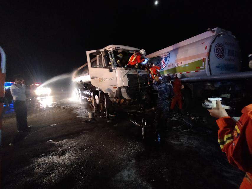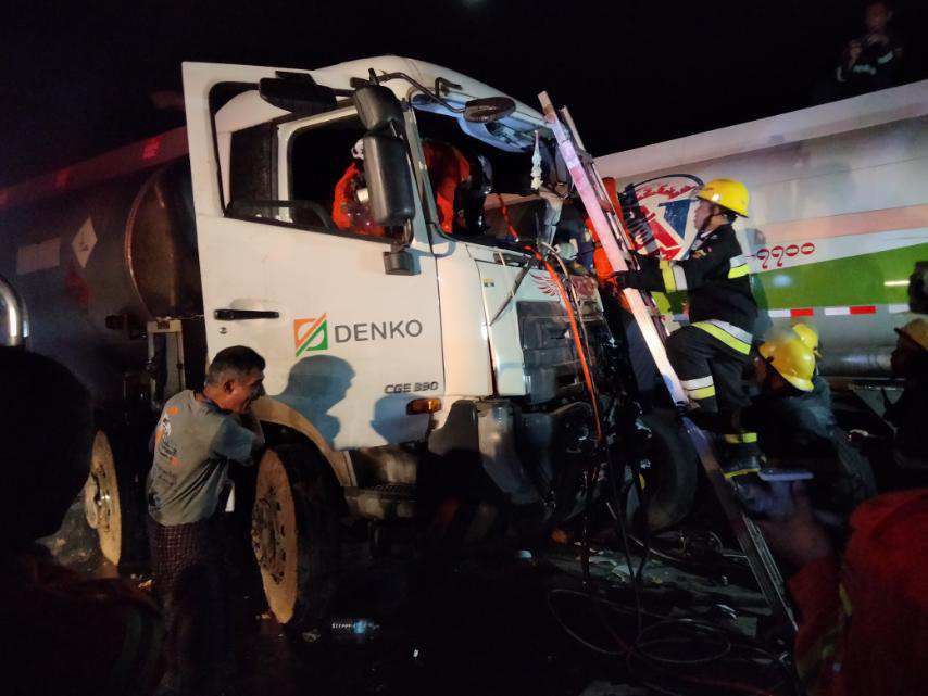 ဖြစ်စဥ်မှာ သန်လျင်မြို့နယ် MITT လမ်းဆုံတွင် စက်တင်ဘာ ၂၂ ရက် ည ၇ နာရီ ၂၈ မိနစ်က ဂါလံ ၃၆၀၀ ဆံ့ ဆီဘောက်ဆာယာဥ်နှင့် ဂါလံ ၇၇၀၀ ဆံ့ ဆီဘောက်ဆာယာဥ်တို့ မျက်နှာချင်းဆိုင်တိုက်မိခဲ့ပြီး ကားအတွင်း ယာဥ်မောင်းအမျိုးသားတစ်ဦးညပ်ကာ ဦးခေါင်းနှင့် ခန္ဓာကိုယ်တွင် ထိခိုက်ဒဏ်ရာရရှိခဲ့ကြောင်း ရန်ကုန်တိုင်းဒေသကြီး မီးသတ်ဦးစီးဌာနထံမှ သိရသည်။