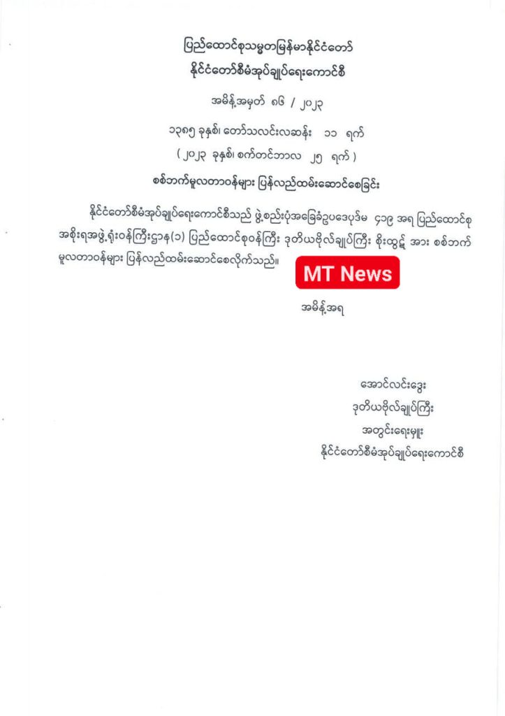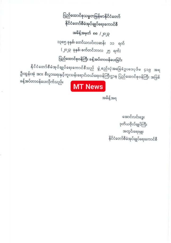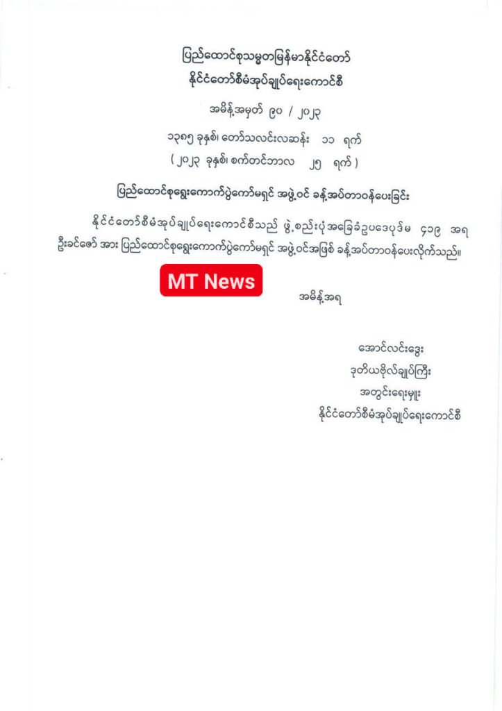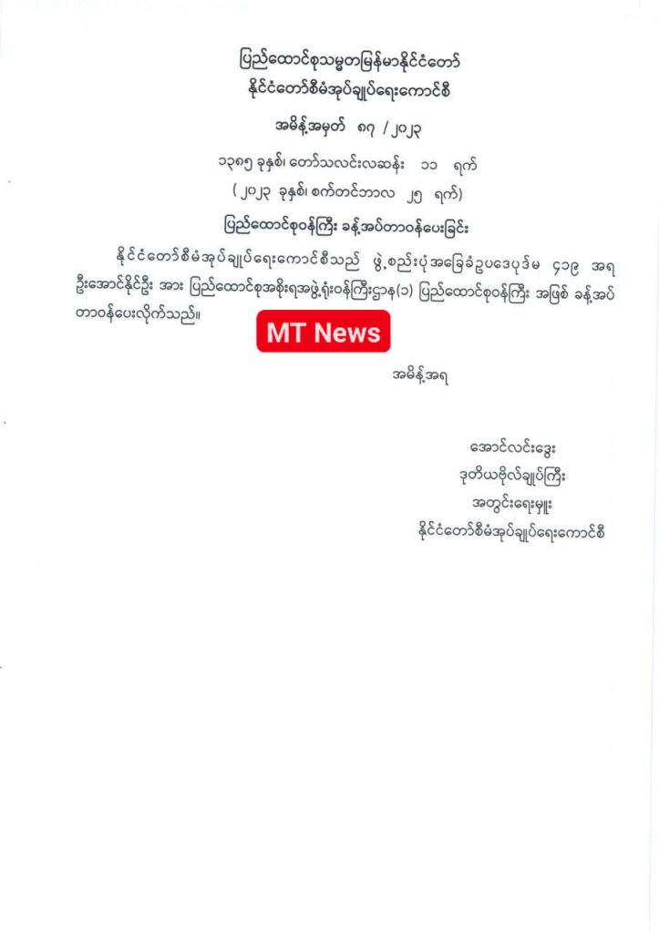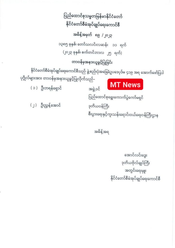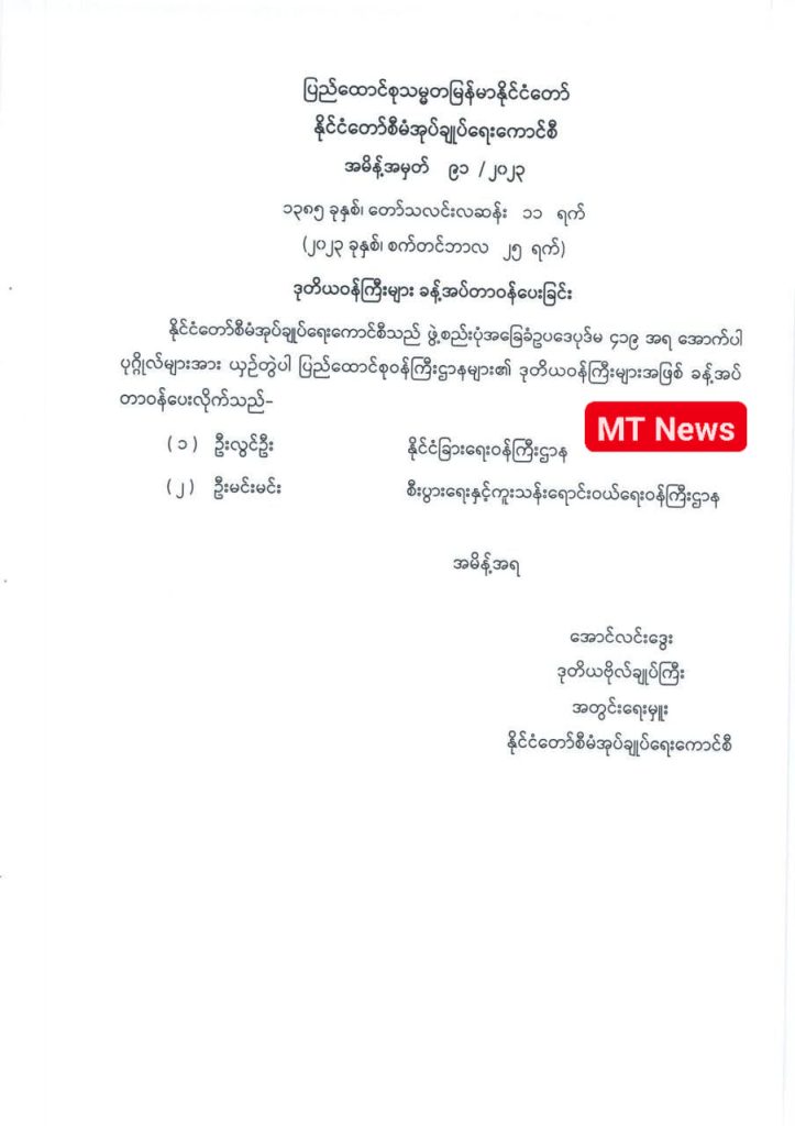 SAC အစိုးရအဖွဲ့အား ယနေ့ ပြန်လည် ပြင်ဆင်ဖွဲ့စည်းခြင်းနှင့် တာဝန်ရှိသူအချို့အား နေရာပြောင်းလဲမှုဆိုင်ရာ ညွှန်ကြား ချက်များကို MT News သတင်းဌာနက ပြန်လည်ဖော်ပြအပ်ပါသည်။