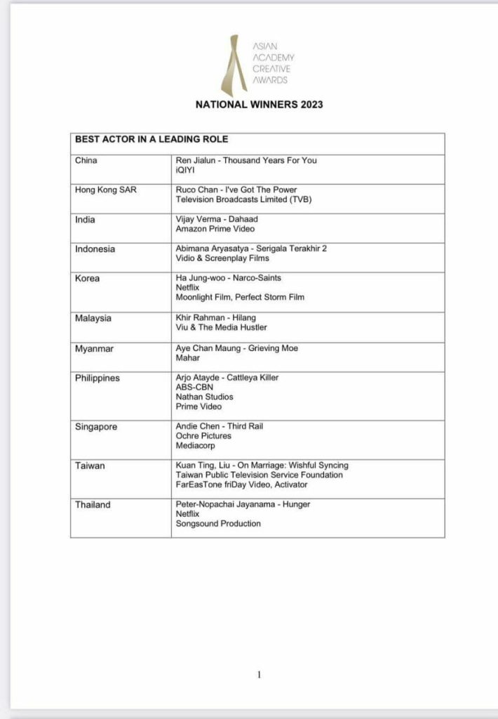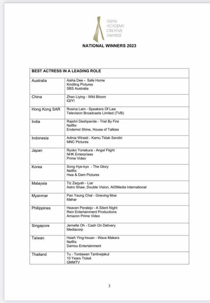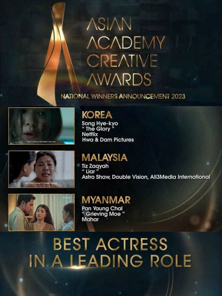 Singapore နိုင်ငံရဲ့ အာရှအနုပညာဖန်တီးမှုအကယ်ဒမီဆုချီးမြှင့်တဲ့ Asian Academy Creative Awards ရဲ့ Best Actor/Actress in Leading Role – National Winner မှာ “တမြေ့မြေ့မိုး” ဇာတ်လမ်းတွဲနဲ့ အေးချမ်းမောင်၊ ပန်းရောင်ခြယ်တို့က ဆန်ကာတင် အရွေးချယ်ခံရပါတယ်။