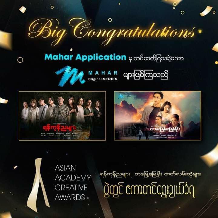 Mahar ရဲ့ Original Series တစ်ခုဖြစ်တဲ့ “တမြေ့မြေ့မိုး” ဇာတ်လမ်းတွဲမှ Best Actor in Leading in A Leading Role အနေနဲ့ အေးချမ်းမောင် ၊ Best Actress in A Leading Role အနေနဲ့ ပန်းရောင်ခြယ်တို့က ဆန်ကာတင်စာရင်းတွေပါဝင်ခဲ့သလို Best Direction (Non-Fiction) ကိုလည်း “ရန်ကုန်ညများ” ကိုရိုက်ကူးပုံဖော်ထားတဲ့ ဒါရိုက်တာ Sai Nyan Linn Set က ဆန်ကာတင် အရွေးချယ်ခံရတယ်လို့ သိရပါတယ်။