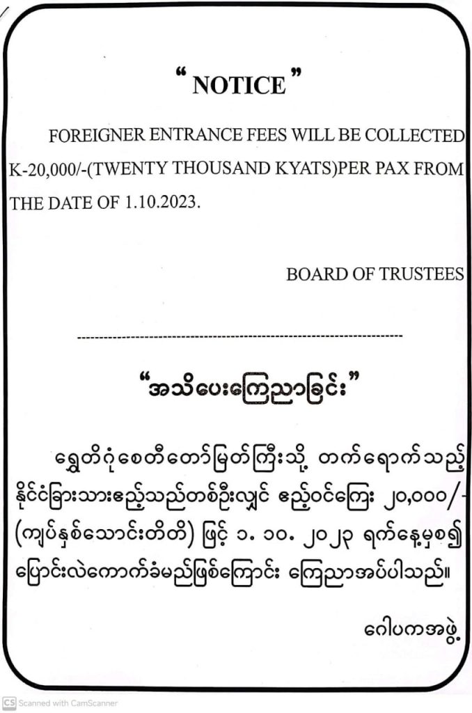 ရွှေတိဂုံစေတီတော်မြတ်ကြီးသို့ တက်ရောက်သည့် နိုင်ငံခြားသားဧည့်သည် တစ်ဦးလျှင် ဧည့်ဝင်ကြေး ကျပ် ၂၀,၀၀၀ ဖြင့် ၂၀၂၃ ခုနှစ် အောက်တိုဘာ ၁ ရက်မှစတင်၍ ပြောင်းလဲကောက်ခံမည်ဖြစ်ကြောင်း ရွှေတိဂုံစေတီတော် ဂေါပကအဖွဲ့မှ ယနေ့တွင် အသိပေးကြေညာထားသည်။