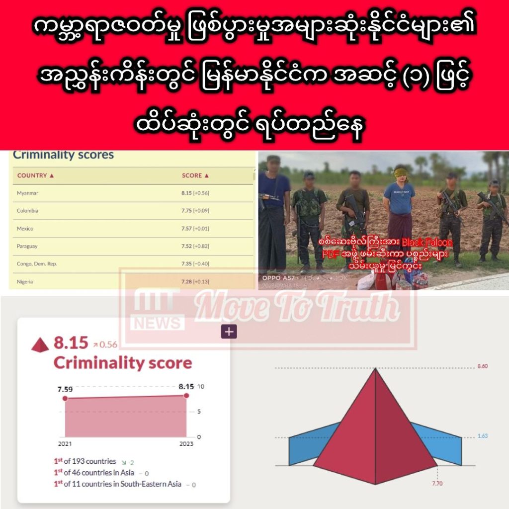 မြန်မာနိုင်ငံသည် ၂၀၂၃ ခုနှစ်အတွက် ကမ္ဘာ့ရာဇဝတ်မှုအများဆုံးဖြစ်ပွားနေသည့်အညွှန်းကိန်းအဆင့် (Global Organized Crime Index) သတ်မှတ်ချက်တွင် ထိပ်ဆုံးနေရာ ရပ်တည်လျက်ရှိနေကြောင်း သိရသည်။
