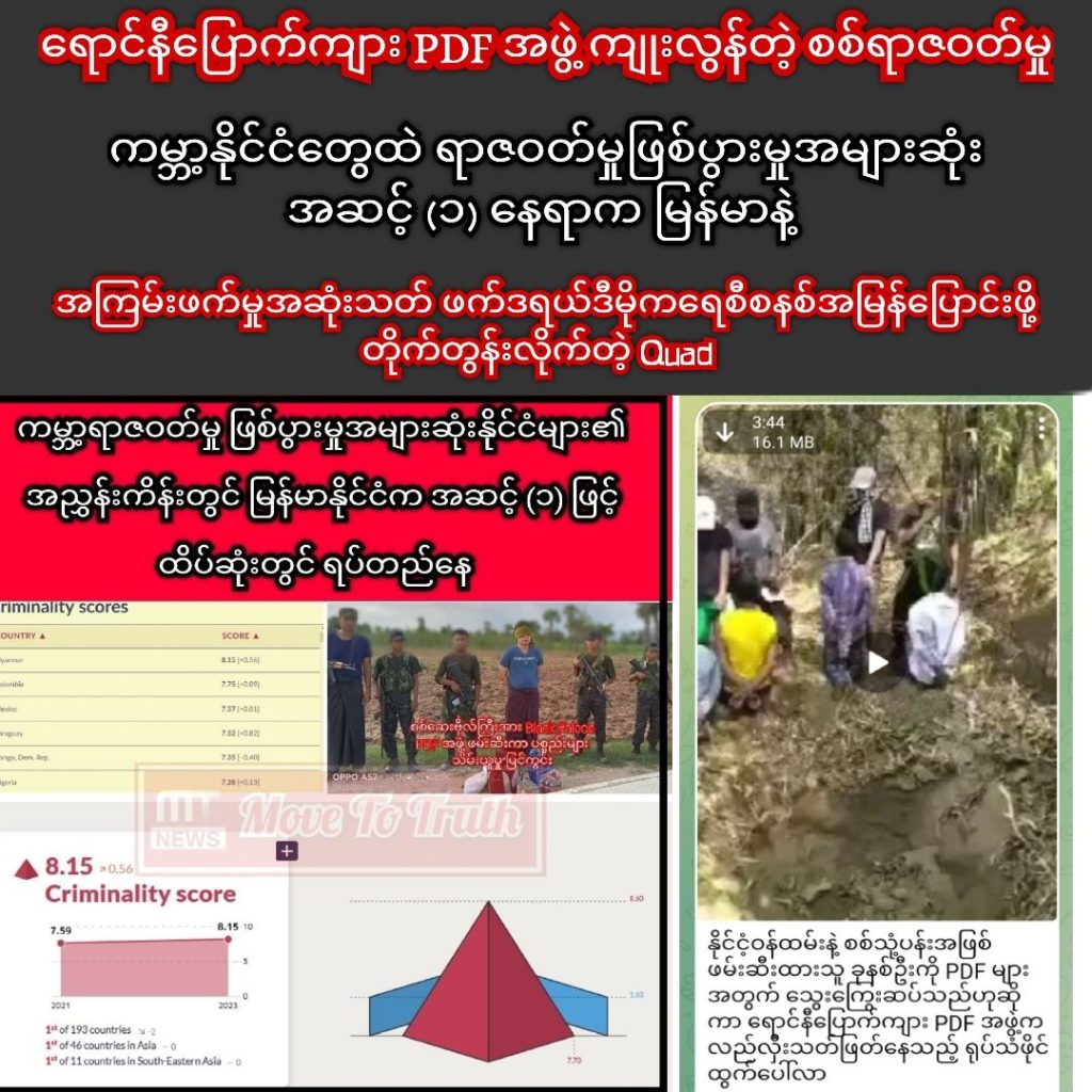 တစ်ဖက်မှာလည်း PDF ဆိုပြီး လက်နက်ကိုင်သွားတဲ့ လူငယ်တစ်သိန်းလောက်ဟာ အလုပ်မလုပ်ဘဲ လက်နက်ကိုင်ကြ၊ စစ်ရေးပြင်ဆင်ကြ၊ စစ်တိုက်ကြဆိုတဲ့နေရာမှာ သူတို့ကိုထောက်ပံ့တဲ့ အလှူငွေကလည်း ဆင့်ပါးစပ်နှမ်းပက်ပါ။ ဒီလိုအခြေအနေမျိုးမှာ စစ်မတိုက်နိုင်ရင်လည်း အသက်ပေးရတော့မှာမို့လို့ တစ်ဖက်ကလက်နက်အားကိုးနဲ့ MG6 PDF လိုမျိုး လုယက်ဓားပြတိုက်တာ၊ စိတ်မထင်တဲ့သူတွေ ဒလန်တံဆိပ်ကပ်ပြီး ပိုင်ဆိုင်မှုကိုကျတော့ တော်လှန်ရေးသုံးဖို့သိမ်းတယ်ဆိုပြီး လုယက်မှုတွေ မျက်နှာပြောင်တိုက်ကျုးလွန်တာ၊ ဆက်ကြေးကောက်တာမျိုးတွေ လုပ်လာရပါတယ်။ အပေါ်မှာပြောပြီးသားပဲထပ်ပြောပါမယ်။ နိုင်ငံနဲ့ပြည်သူကာကွယ်ဖို့ လက်နက်ကိုင်ရပါတယ်ဆိုတဲ့သူတွေက လုယက်သတ်ဖြတ်ဓားပြတိုက်နေတဲ့နိုင်ငံတစ်ခုဟာ ကမ္ဘာ့ရာဇဝတ်မှုအများဆုံးနိုင်ငံထဲမှာ အဆင့်( ၁) ဖြစ်တာ မဆန်းပါဘူးဆိုတာပါပဲ။