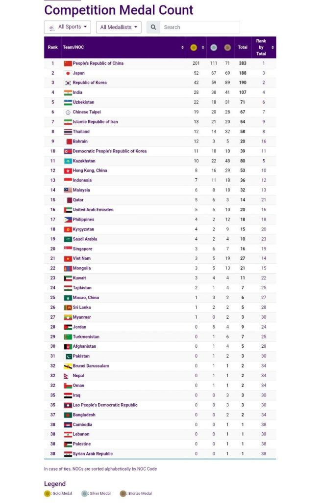 အာရှအားကစားပြိုင်ပွဲအပြီးမှာ အိမ်ရှင်တရုတ်က ရွှေ ၂၀၁ ခု ဆုတံဆိပ်ရရှိမှုပေါင်း ၃၈၃ ခုနဲ့ ဆုတံဆိပ်ဇယားကို ထိပ်ဆုံးက ဦးဆောင်ခဲ့ပြီး ဂျပန်က ရွှေ ၅၂ စုစုပေါင်း ဆုတံဆိပ် ၁၈၈ နဲ့ဒုတိယနေရာ၊ တောင်ကိုရီးယားက ရွှေ ၄၂ ခု စုစုပေါင်းဆုတံဆိပ် ၁၉၀ နဲ့ တတိယ၊ အိန္ဒိယနိုင်ငံက ရွှေ ၂၈ ခု စုစုပေါင်း ဆုတံဆိပ် ၁၀၇ ခုနဲ့ စတုတ္ထနေရာရပ်တည်နေပြီး ဥဇဘက်ကစ္စတန်ကတော့ ရွှေ ၂၂ ခု စုစုပေါင်းဆုတံဆိပ် ၇၁ နဲ့ ပဥ္စမနေရာရပ်တည်ခဲ့ပါတယ်။