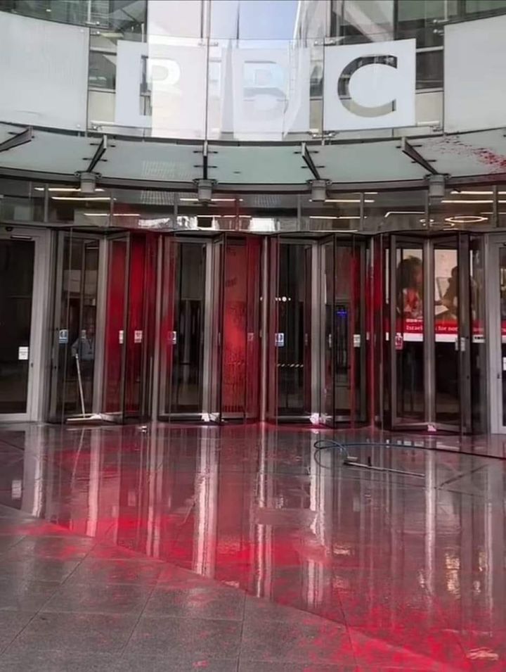 Palestine Action က ဘီဘီစီ၏ သတင်းထုတ်လွှင့်မှုမှာ ပါလက်စတိုင်းတို့ မျိုးတုံးအောင်သတ်ဖြတ်နေမှုများအတွက် သဘောတူလုပ်ကြံသတင်းဖန်တီးဖော်ပြမှုအား တုံ့ပြန်သည့်အမှတ်သညာအဖြစ် ဤသို့ သွေးရောင်ဆေးနီများဖြင့် ဘီဘီစီအဆောက်အအုံအားသုတ်လိမ်းခဲ့ခြင်းဟု ဆိုသည်။