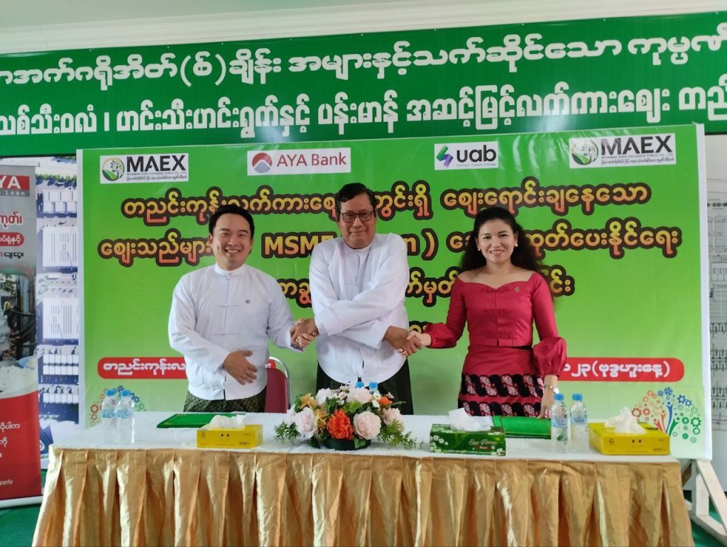 အောက်တိုဘာ ၂၀ ရက်မှစတင်၍ တညင်းကုန်းလက်ကားဈေးအတွင်းရှိ ဈေးသူဈေးသားများ စီးပွားရေးလုပ်ငန်းတိုးချဲ့နိုင်စေရန် AYA Bank နှင့် UAB ဘဏ်တို့နှင့် ချိတ်ဆက်ပြီး MSME ချေးငွေများ ထုတ်ချေးသွားမည်ဖြစ်ကြောင်း ယနေ့ ပြုလုပ်သည့် တညင်းကုန်းဈေးအတွင်းရှိ ဈေးရောင်းချနေသော ဈေးသည်များအား MSME (Loan) ချေးငွေထုတ်ပေးနိုင်ရေး နား လည်မှုစာချွန်လွှာ လက်မှတ်ရေးထိုးခြင်းအခမ်းအနားမှ သိရသည်။