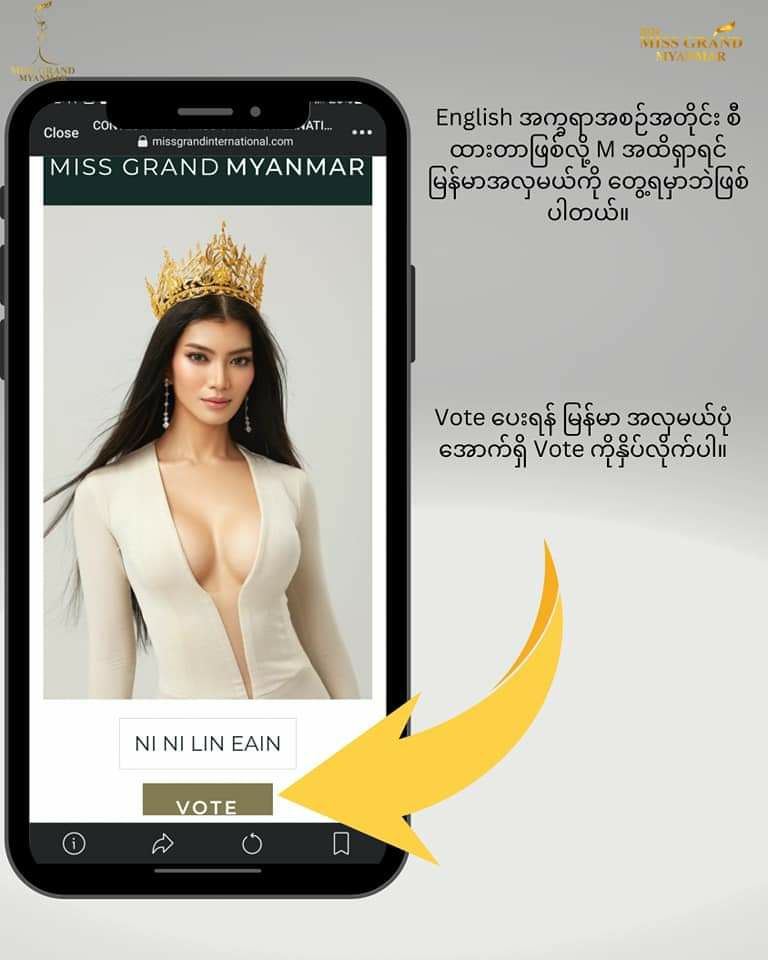 “လက်ရှိ နီနီတို့ Final ပွဲလာဖို့ တစ်ရက်ပဲ လိုတော့တယ်။ နီနီတို့ရဲ့ Miss Popular Vote ကို Vote ပေးဖို့ လိုအပ်ပါတယ်။ Miss Popular Vote ကို Vote ရင် နီနီ Top 10 စာရင်းကို တိုက်ရိုက်ဝင်မှာလည်း ဖြစ်ပါတယ်။ Miss Popular Vote ကို Vote မယ်ဆိုရင် 1 Vote 1Dollor ကျမှာဖြစ်ပါတယ်။ နီနီတို့ရဲ့ Voting က မနက်ဖြန် အောက်တိုဘာ ၂၅ ရက် ည ၈ နာရီမှာ Voting စပိတ်မှာ ဖြစ်ပါတယ်။ နီနီကို ချစ်ခင်အားပေးသူ အားလုံးကို ကျေးဇူးတင်ပါတယ်ရှင့်။ မြန်မာကို ချစ်တဲ့အတွက် မြန်မာကို Support ပေးပါလို့ ပြောချင်ပါတယ်”လို့ Miss Grand Myanmar 2023 အလှမယ် နီနီလင်းအိမ်က ပြောပါတယ်။