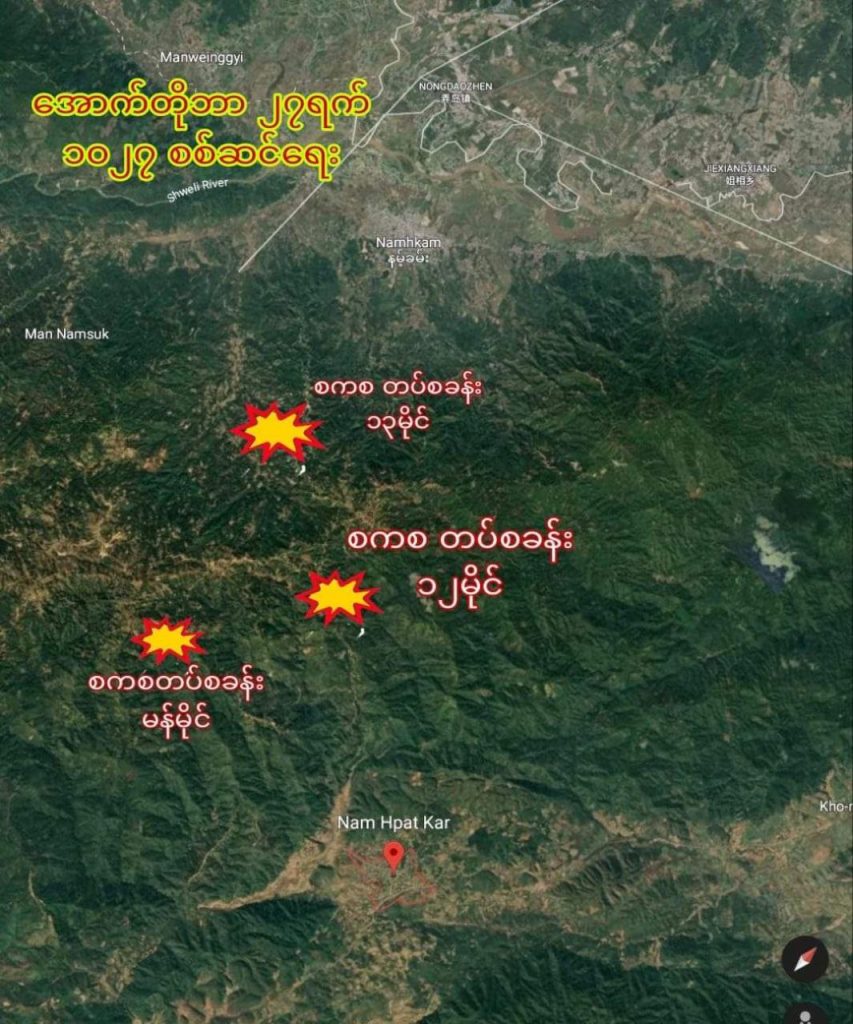 အလားတူ တပ်မဟာ(၁)စစ်ဒေသ၊ နမ့်ခမ်းမြို့နယ်ရှိ နမ့်ခမ်း-နမ့်ဖတ်ကားလမ်း (၁၃)မိုင် တပ်စခန်း၊ (၁၂)မိုင် တပ်စခန်းနှင့် မန်မိုင်တပ်စခန်း(မိုက်ခရိုဝိတ် တာဝါတိုင်တပ်စခန်း) (၃)ခု တို့ကို နံနက်ပိုင်း ၄ နာရီအချိန်တွင် တအာင်းတပ်မတော် PSLF/TNLA တိုက်ခိုက်သိမ်းပိုက်နိုင်ခဲ့ပြီး လခရအလောင်း (၁၈)လောင်းနှင့် လက်နက်ခဲယမ်းများစွာ သိမ်းဆည်းရခဲ့မိသည်။