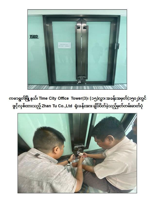 ဖော်ထုတ်ရရှိချက်များအရ Supportfix Co., Ltd အတွက် ဝန်ထမ်းများ ရှာဖွေပေးသူ ကမာရွတ်မြို့နယ်၊ နာနတ်တောလမ်း၊ Dimond Condo (၇) လွှာနေ Zhan Tu Co., Ltd ပိုင်ရှင် ရန်လုံရှင်းအား သွားရောက်ရှာဖွေခဲ့ရာ ထွက်ပြေးတိမ်းရှောင်သွားခဲ့သဖြင့် ရုံးခန်းဖွင့်လှစ်ထားသည့် ကမာရွတ်မြို့နယ်၊ Time City Office Tower (3) (၁၅) လွှာ၊ အခန်းအမှတ် (၁၅၀၂) အား ဆက်လက်ရှာဖွေချိပ်ပိတ် သိမ်းဆည်းခဲ့ကြောင်း သိရှိရသည်။