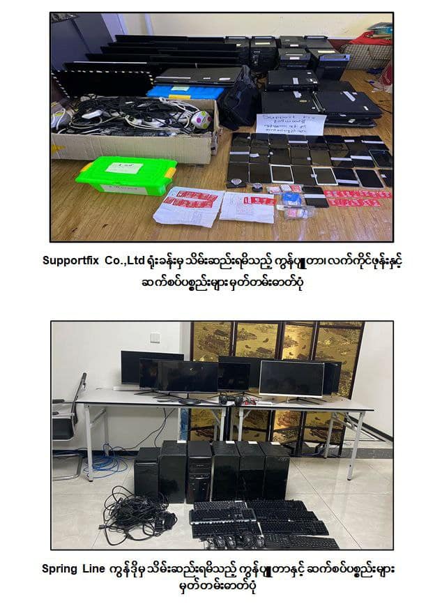 အွန်လိုင်းလိမ်လည်လုပ်ငန်းများ ရှာဖွေဖော်ထုတ်နေမှုအရ အောက်တိုဘာလ ၂၆ ရက်တွင် ရန်ကုန်တိုင်းဒေသကြီး၊ ဦးချစ်မောင်အိမ်ရာ၊ တိုက်အမှတ် (S-19) တွင် ရုံးခန်းဖွင့်လှစ်ထားသည့် Supportfix Co., Ltd အား သတင်းအရ ဝင်ရောက်စီးနင်းရှာဖွေခဲ့ရာ ဇူကျန်း (ခ) လောက်ဖ၊ ၃၄ နှစ်၊ (ဘ) ဦးလောက်ရှီးအပါအဝင် တရားခံ ကျား ၆၆ ဦး၊ မ ၂၂ ဦး စုစုပေါင်း ၈၈ ဦးတို့အား ပြည်ပနိုင်ငံသားများ၏ အချက်အလက်များစုဆောင်း၍ ငွေကြေးလိမ်လည်နိုင်ရေးဆောင်ရွက်ရာတွင် အသုံးပြုသည့် ကွန်ပျူတာ၊ မိုဘိုင်းဖုန်း စသည့် ဆက်စပ်ပစ္စည်းများနှင့်အတူ ဖမ်းဆီးရရှိခဲ့သည်။