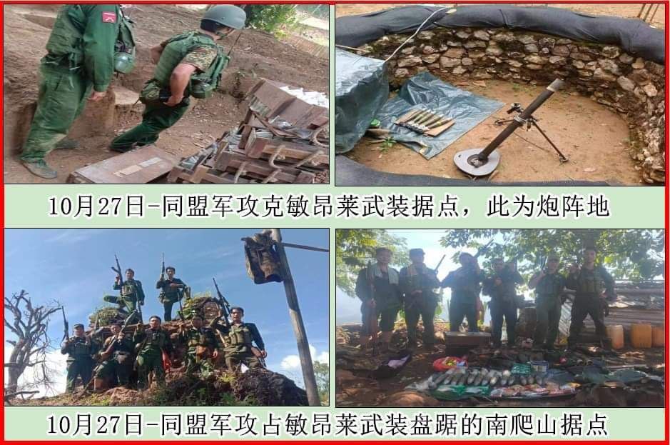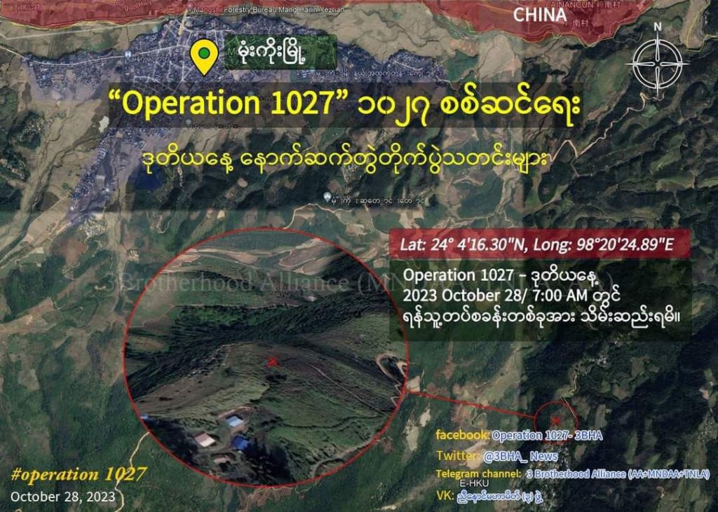 “Operation 1027” ၁၀၂၇ စစ်ဆင်ရေးအဖြစ် ယမန်နေ့က စတင်တိုက်ခိုက်ရာ ၂၀၂၃ ခုနှစ် အောက်တိုဘာ၂၈ ရက်၊ ညနေ ၄ နာရီ ၄၀ မိနစ်အချိန်တွင် ချင်းရွှေဟော်ပတ်လည်ရှိ တပ်စခန်းကုန်းအားလုံး သိမ်းပိုက်ထားနိုင်ကြောင်း မြောက်ပိုင်းသုံးဖွဲ့က ကြေညာချက် ထုတ်ပြန်သည်။