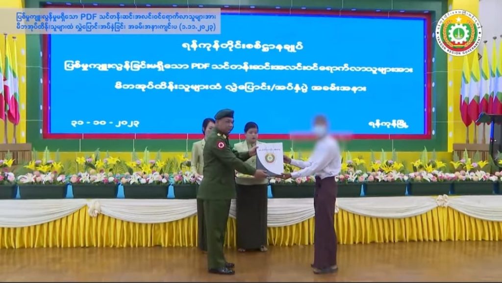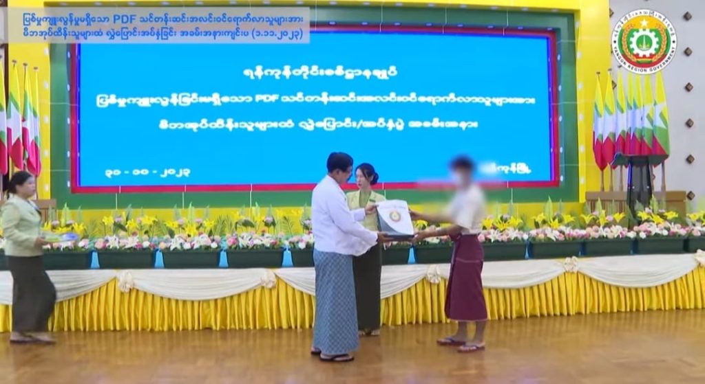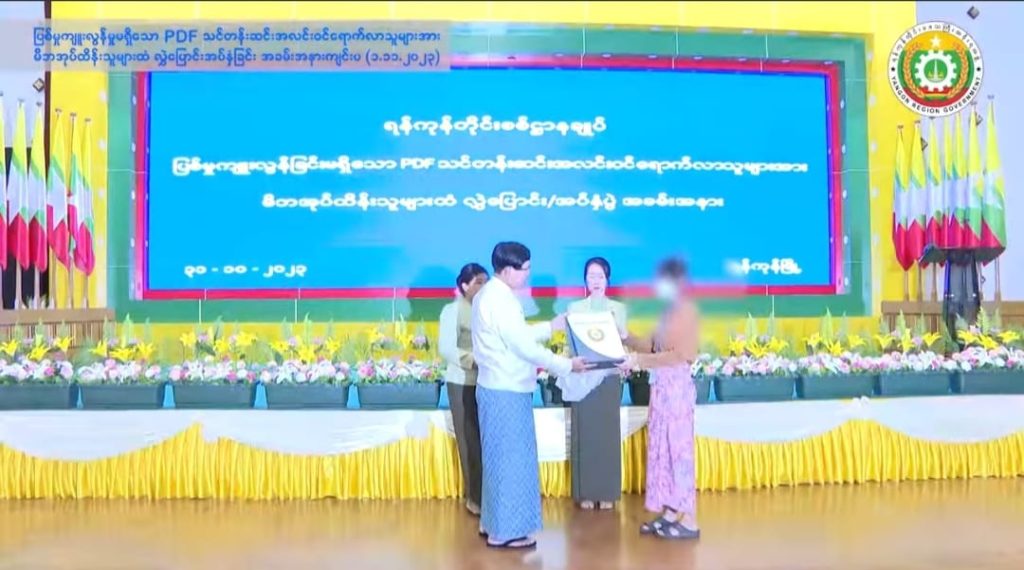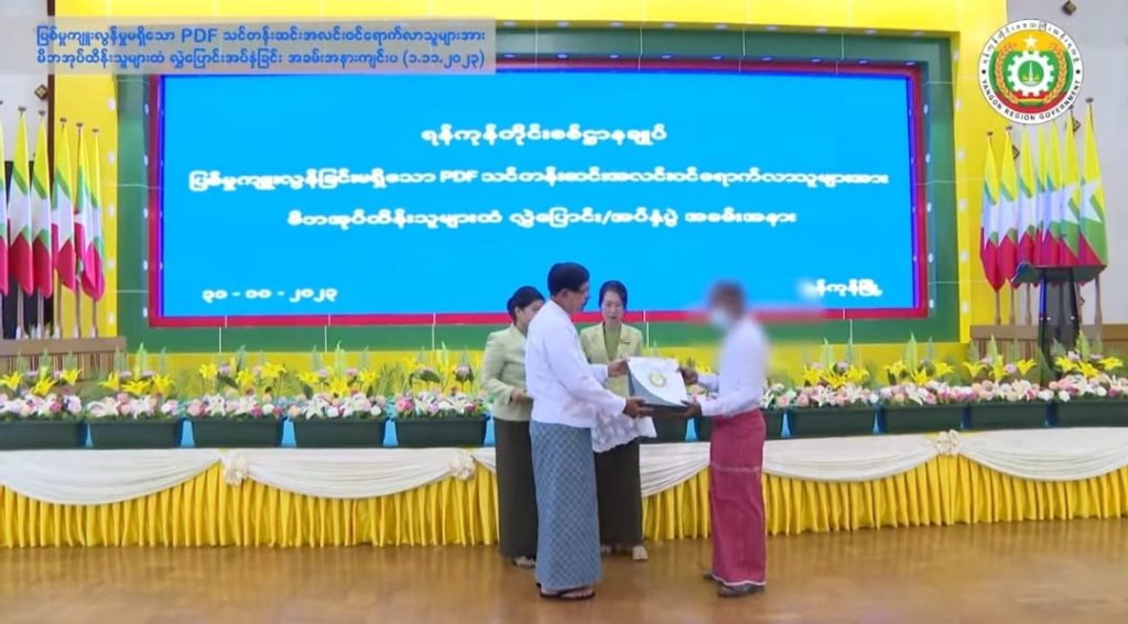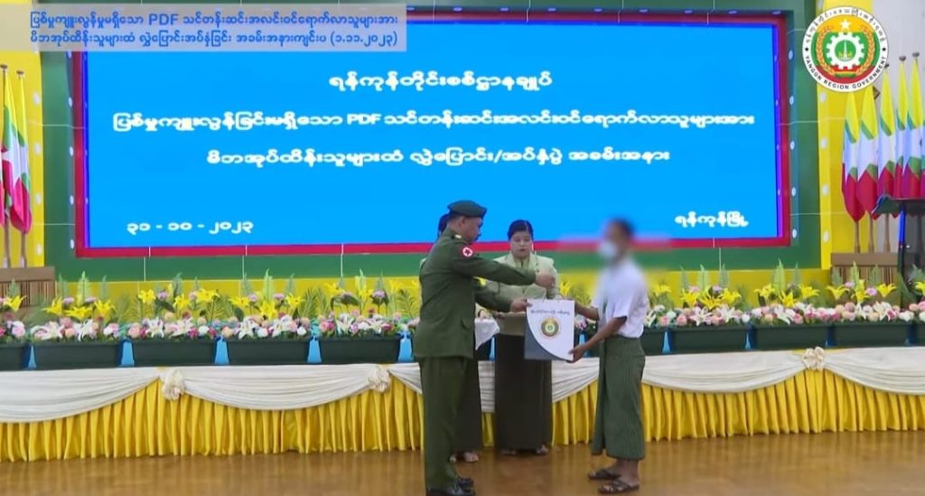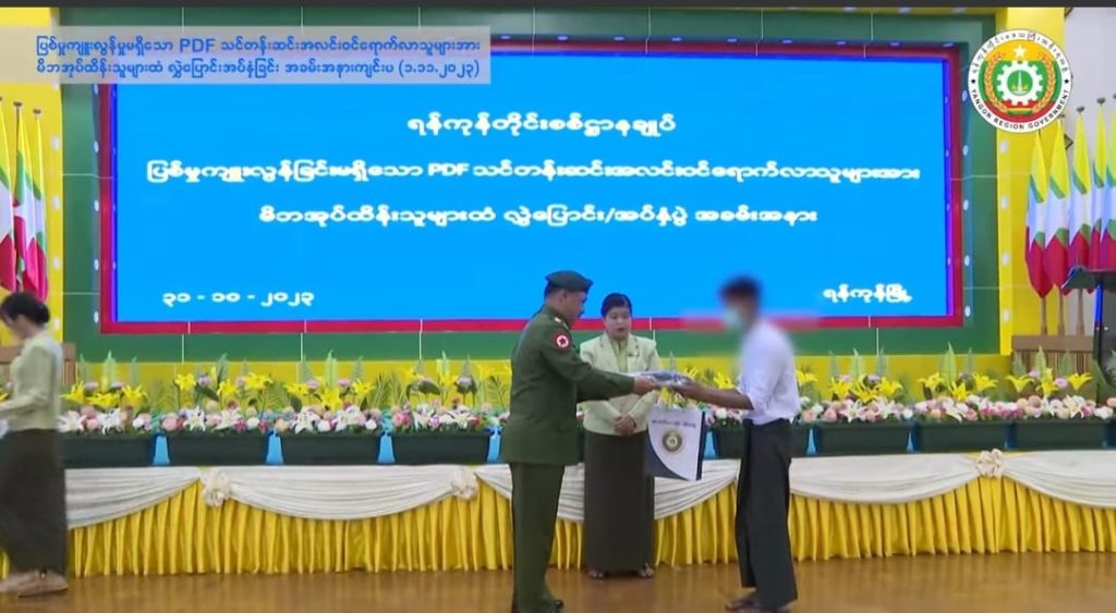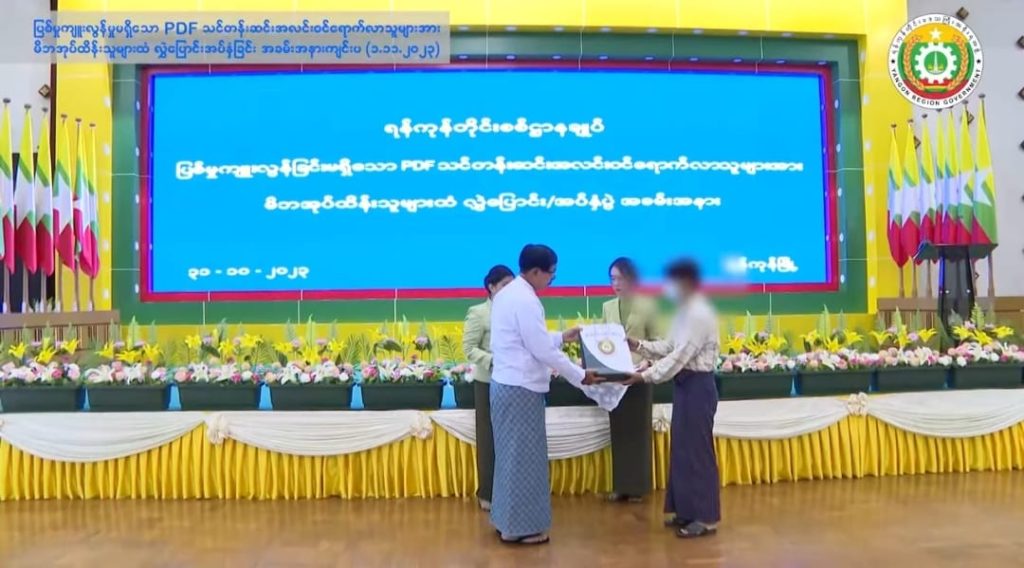 ထို့နောက် တိုင်းဒေသကြီး ဝန်ကြီးချုပ်နှင့် ရန်ကုန်တိုင်းစစ်ဌာနချုပ် တိုင်းမှူး ဗိုလ်ချုပ် ဇော်ဟိန်းတို့က ပြစ်မှုကျူးလွန်မှုမရှိသော PDF သင်တန်းဆင်း အလင်းဝင်ရောက်လာသူ (၇)ဦးကို မိသားစုဝင်များထံ လွှဲပြောင်းအပ်နှံပြီး အမှတ်တရလက်ဆောင်ပစ္စည်းများ ပေးအပ်ခဲ့သည်ဟု သိရသည်။