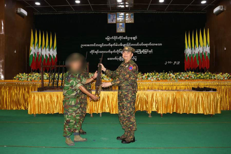ပြစ်မှုကျူးလွန်ခြင်း မရှိသော PDF အဖွဲ့မှ ဥပဒေဘောင်အတွင်းသို့ ပြန်လည်ဝင်ရောက်လာသူများအား မိဘအုပ်ထိန်းသူများထံ ပြန်လည်လွှဲပြောင်းပေးအပ်ခြင်းကို မြောက်ပိုင်းတိုင်းစစ်ဌာနချုပ် ဗလမင်းထင်ခန်းမ၌ ယမန် နေ့ကပြုလုပ်ရာ တိုင်းမှူး ဗိုလ်မှူးချုပ် စိုးလှိုင်နှင့် တာဝန်ရှိသူများ၊ ဌာနဆိုင်ရာတာဝန်ရှိသူများနှင့် ဖိတ်ကြားထားသူများ တက်ရောက်ကြသည်။