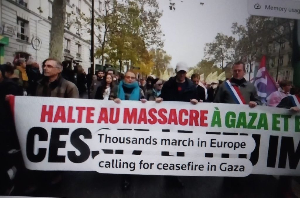 ပြင်သစ်နိုင်ငံ၊ ပါရီမြို့တွင်လည်း ဆန္ဒပြသမားများက ‘အကြမ်းဖက်မှုသံသရာရပ်တန့်ပါ’၊ ‘ဘာမှမလုပ်ဘဲ၊ ဘာမှမပြောဘဲနေရင် အကြမ်းဖက်မှုမှာ ပူးပေါင်းကျူးလွန်မှုပဲ’ ဟုစာတန်းများကိုင်ဆောင် ချီတက်ခဲ့ကြသည်။ ပါရီမြို့တွင် ပါလက်စတိုင်းထောက်ခံရေးဆန္ဒပြပွဲများကို ငြိမ်ဝပ်ပိပြားရေးထိခိုက်မည်စိုး၍ ပြင်သစ်အစိုးရက ယခင်က ကျင်းပခွင့်မပေးခဲ့ဘဲ ယခုဆန္ဒပြပွဲက ပါရီတွင် ပထမဆုံးသော ပါလက်စ တိုင်း ထောက်ခံရေးဆန္ဒပြပွဲလည်း ဖြစ်သည်။