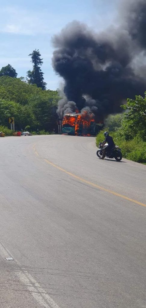 မြဝတီ-ကော့ကရိတ် အာရှလမ်းတောင်ပတ်လမ်းတွင် ရန်ကုန်မှ မြဝတီသို့ တက်လာသည့် ခရီးသည်တင်ယာဉ် တစ်စီးမီးလောင်မှု ယနေ့တွင် ဖြစ်ပွားခဲ့ကြောင်း သင်္ဃန်းညီနောင် မြို့သစ်လူမှုကယ်ဆယ်ရေးအဖွဲ့မှ သိရသည်။