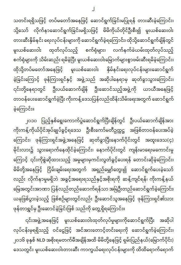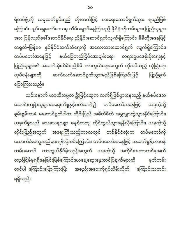 လက်ရှိဖြစ်ပွားနေသည့် နယ်စပ်ဒေသသောင်းကျန်းသူများအရေးကိစ္စနှင့် ပတ်သက်၍ တပ်မတော်အနေဖြင့် ယခုကဲ့သို့ စွမ်းစွမ်းတမံမဆောင်ရွက်ပါက တိုင်းပြည်အစိတ်စိတ်အမွှာမွှာကွဲသွားနိုင်ကြောင်း၊ ယခုကိစ္စသည် သေသေချာချာ စနစ်တကျ ကိုင်တွယ်သွားရန်လိုအကြောင်း၊ ယခုကဲ့သို့ တိုင်းပြည် အရေးကြီးသည့် ကာလတွင် တစ်နိုင်ငံလုံးက တပ်မတော်ကို ထောက်ခံအကူအညီပေးရန် လိုအပ်ကြောင်း၊ တပ်မတော်အနေဖြင့် အသက်စွန့် တာဝန်ထမ်းဆောင် ကာကွယ်နိုင်ခဲ့သည့် အတွက် ယခုကဲ့သို့ အတိုင်းတာတစ်ခုအထိ တည်ငြိမ်မှုရရှိနေခြင်းဖြစ်ကြောင်းလည်း ယာယီသမ္မတဦးမြင့်ဆွေက ပြောကြားသည်။
