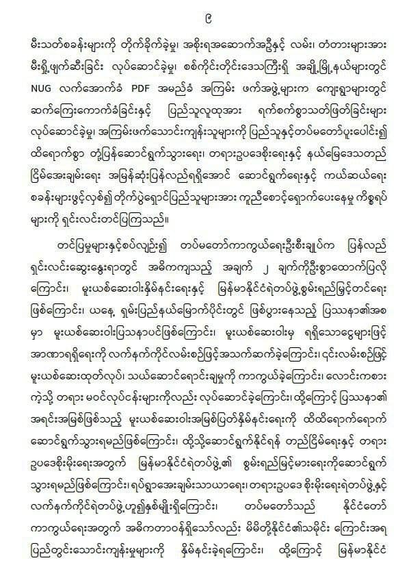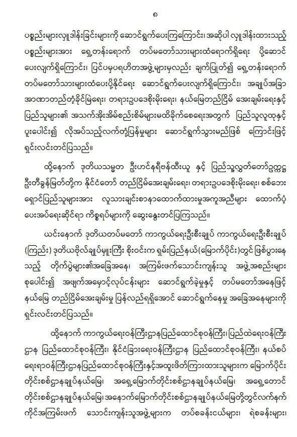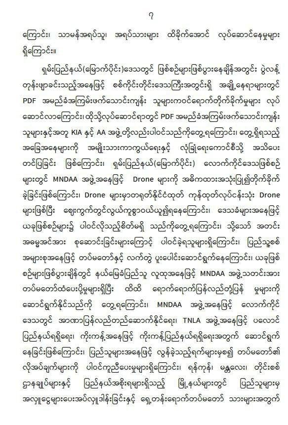 ရှမ်းမြောက်ဒေသနှင့် စစ်ကိုင်းတိုင်းအတွင်း ဖြစ်ပွားနေမှုများအား အချုပ်အခြာအာဏာတည်တံ့ခိုင်မြဲရေး၊ တရားဥပဒေစိုးမိုးရေး၊ နယ်မြေတည်ငြိမ်အေးချမ်းရေးနှင့် ပြည်သူများ၏ အသက်အိုးအိမ်စည်းစိမ်များ မထိခိုက်စေရေးအတွက် ပြည်သူလူထုနှင့် ပူးပေါင်း၍ လိုအပ်သည့် လက်တုံ့ပြန်မှုများ ဆောင်ရွက်သွားမည်ဖြစ်ကြောင်း နိုင်ငံတော်စီမံအုပ်ချုပ်ရေးကောင်စီ (SAC) ဥက္ကဋ္ဌ ဗိုလ်ချုပ်မှူးကြီးမင်းအောင်လှိုင်က ယနေ့ ပြုလုပ်သည့် အမျိုးသားကာကွယ်ရေးနှင့် လုံခြုံရေးကောင်စီအစည်းအဝေး (၃/၂၀၂၃)တွင် ပြောကြားသည်။