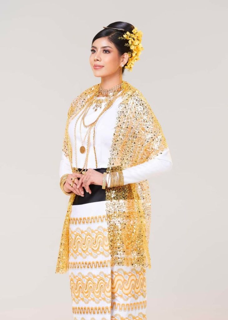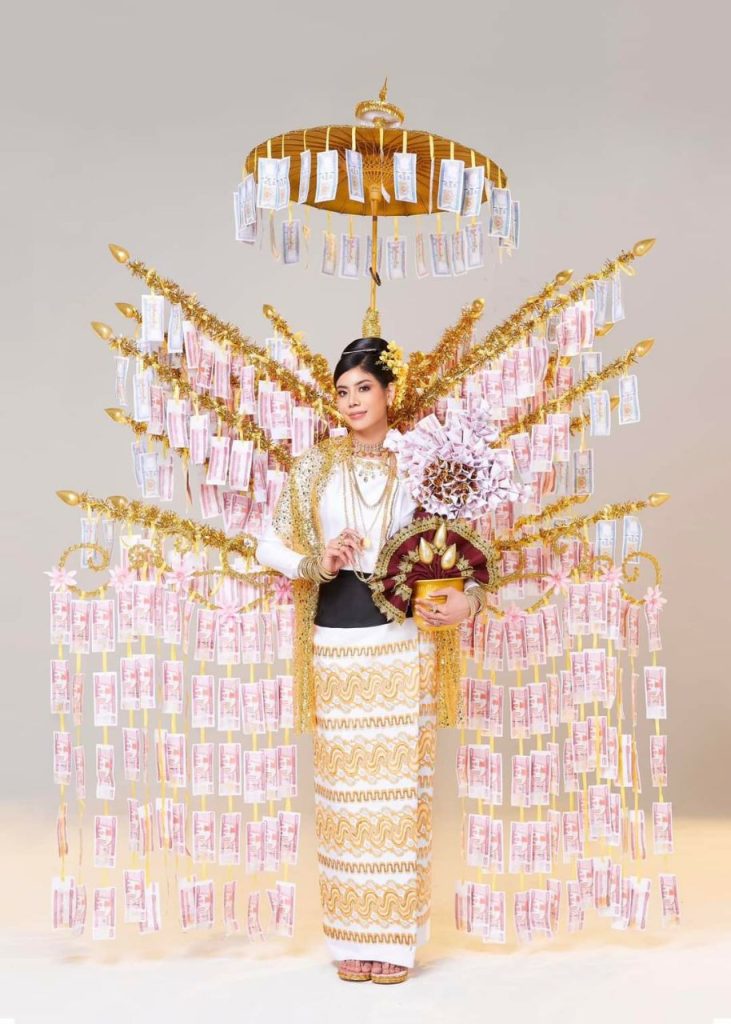 သူမရဲ့ National Costume အနေနဲ့ မြန်မာ့ငွေပဒေသာပင်ဝတ်စုံကတော့ သာသနာထွန်းကားတဲ့ မြန်မာနိုင်ငံမှာ လှူဒါန်းခြင်းဆိုတဲ့ ရိုးရာဓလေ့တစ်ခုကို ချစ်စဖွယ်ပြုမူလေ့ရှိကြပါတယ်။ အဲဒီထဲမှာမှ ကထိန်ကာလမှာ မိမိတို့ရဲ့ ချွေးနည်းစာနဲ့ သာသနာပြု ပုဂ္ဂိုလ်များကို ငွေပဒေသာပင်တွေ ပြုလုပ်လှူဒါန်းခြင်းဆိုတဲ့ မြန်မာ့ရိုးရာ ယဉ်ကျေးမူ့ကို ဖော်ပြထားတာလည်း ဖြစ်ပါတယ်။