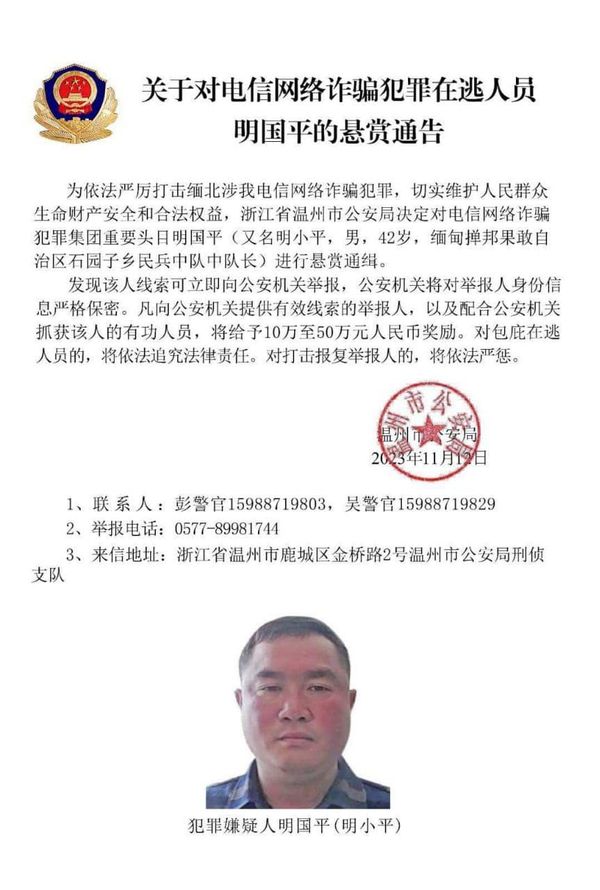 အွန်လိုင်းလိမ်လည်မှုခေါင်းဆောင်ဆိုပြီး ကိုးကန့်ထိပ်တန်းလုပ်ငန်းရှင် မိသားစုဝင် ၄ ဦးကို တရုတ်ပြည်သူ့ရေးရာလုံခြုံရေးဝန်ကြီးဌာနက ဖမ်းဝရမ်းထုတ်လိုက်ပြီး ဒီလူလေးဦးကို သတင်းပေးမယ်ဆို တစ်ဦးအတွက် ယွမ်တစ်သိန်းကနေ ငါးသိန်းအကြား ဆုချီးမြှင့်မယ်လို့ ထုတ်ပြန်ထားပါတယ်။